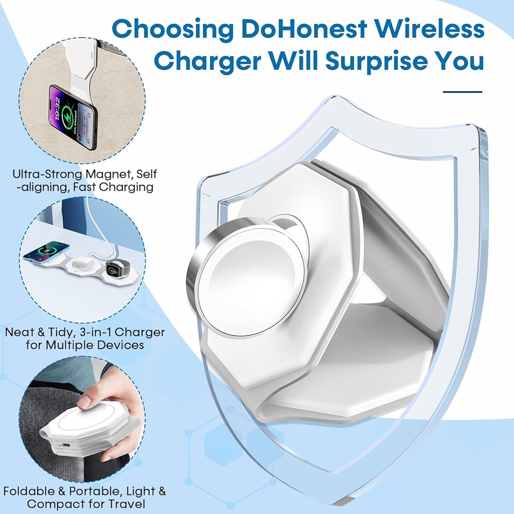 【شاحن لاسلكي 3 في 1】تعد محطة الشحن اللاسلكية DoHonest 3 في 1 لأجهزة Apple خيارًا رائعًا لتنظيم منزلك أو مكتبك أو سفرك. إنها تحافظ على المساحة الخاصة بك نظيفة ومنظمة. مع شاحن iPhone اللاسلكي، يمكنك بسهولة شحن iPhone وApple Watch وAirPods، مما يوفر راحة وسهولة كبيرة لحياتك.