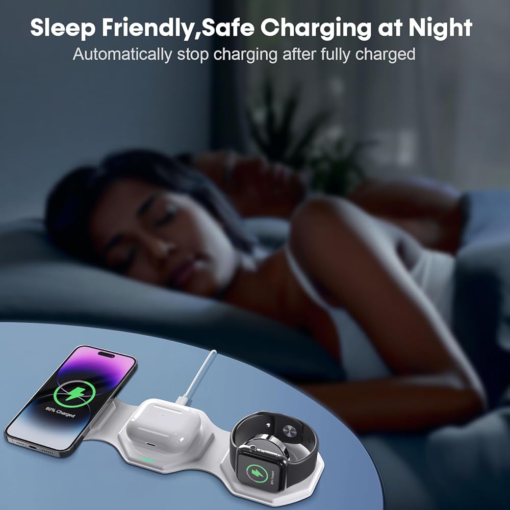 شاحن لاسلكي 3 في 1 لهاتف iPhone MagSafe قابل للطي - قاعدة شحن مغناطيسية للسفر بسرعة 18 وات، حامل شاحن محمول من السيليكون الناعم مناسب للنوم لهاتف iPhone 15/14/13/12 Apple Watch AirPods Pro Qi