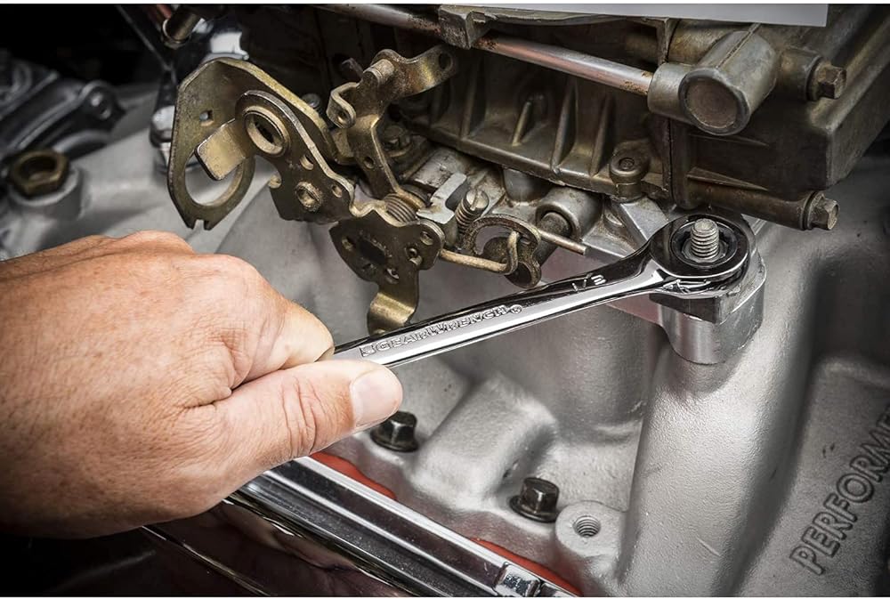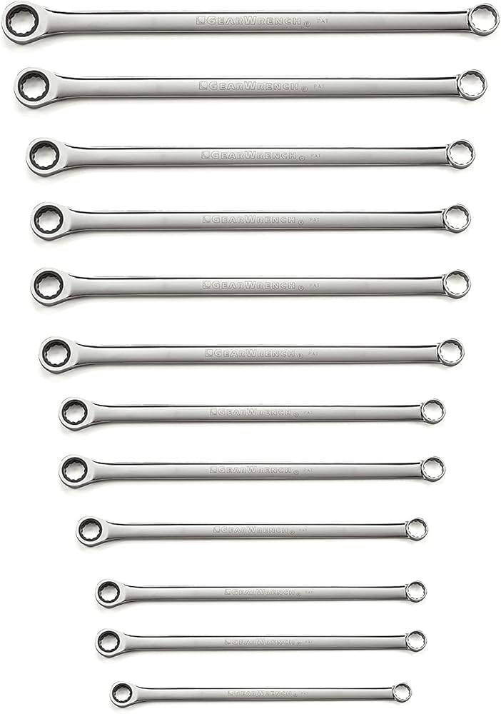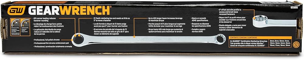 GEARWRENCH 85989 17-Piece XL GearBox Double Box End metric ratcheting wrench set consists of 1 of each 8mm, 9mm, 10mm, 11mm, 12mm, 13mm, 14mm, 15mm, 16mm, 17mm, 18mm, 19mm, 20mm, 21mm, 22mm, 24mm, and 25mm XL GearBox ratcheting wrenches. Ratcheting box end needs as little as 5-Degree to move the fastener as opposed to 30-Degree for standard box end wrenches. The standard box end combined with the long pattern length gives this wrench excellent torque capabilities to break a stubborn, rusted fastener. The ratcheting box end then makes the loosening or tightening of the fastener fast and safe. The box end features improved strength from GearWrench Surface Drive technology and at the same time, reduces fastener rounding. These double box end ratcheting wrenches are made from premium alloy steel for a precision, long lasting tool. The set comes packed in a blow molded tray that fits nicely in your tool box.