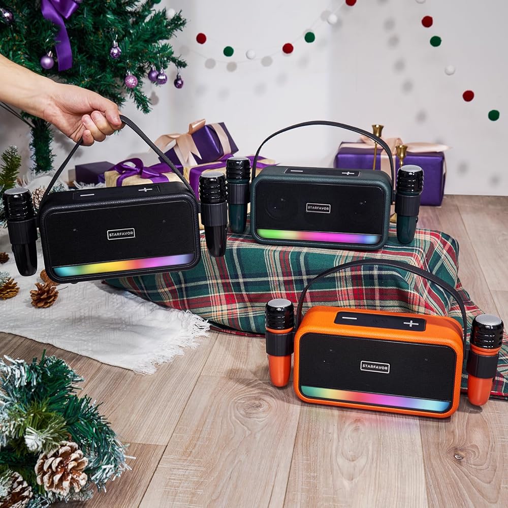 [تصميم محمول أنيق] سواء كانت آلة كاريوكي للتلفزيون أو خيارًا محمولاً للتجمعات الخارجية، فإن مكبر صوت الكاريوكي هذا يتميز بتصميم أنيق، بقياس 10.12 × 7.68 × 4.65 بوصة. إن تضمين حبل التخزين يجعل من السهل حملها، مما يضمن لك الاستمتاع بترفيه الكاريوكي في أي مكان وفي أي وقت.