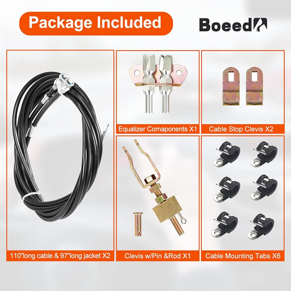✅Package Included:Parking Brake Cable Kit includes 110 "long cable and 97" long jacket, equalizer components, U-clips and hardware.