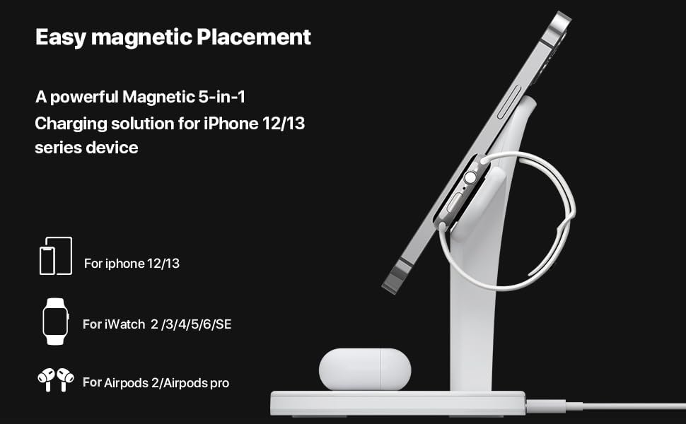 Introducing MagSafe Magic, the ultimate charging solution for your Apple devices and beyond. Simply place your iPhone 15, 14, 13, or 12 series phone on the magnetic pad for secure, lightning-fast charging up to 15W. With its I Watch Friendly design, you can charge any Smart Watch, from the Ultra down to Series 2, using the dedicated wireless charger. Say goodbye to cable clutter with the AirPods Powerhouse feature, effortlessly charging your AirPods Pro or AirPods 3 on the wireless charging pad. But it's more than just Apple—this versatile charger includes 2 USB-A ports and 1 USB-C port, providing flexible charging options for devices like tablets, headphones, or power banks. Safety is paramount with advanced features such as overcharge protection, temperature control, and foreign object detection, ensuring safe and reliable charging every time. The sleek and stylish design, with a non-slip base, keeps your space organized and adds a touch of elegance to any desk or nightstand. Experience the convenience and sophistication of MagSafe Magic today.