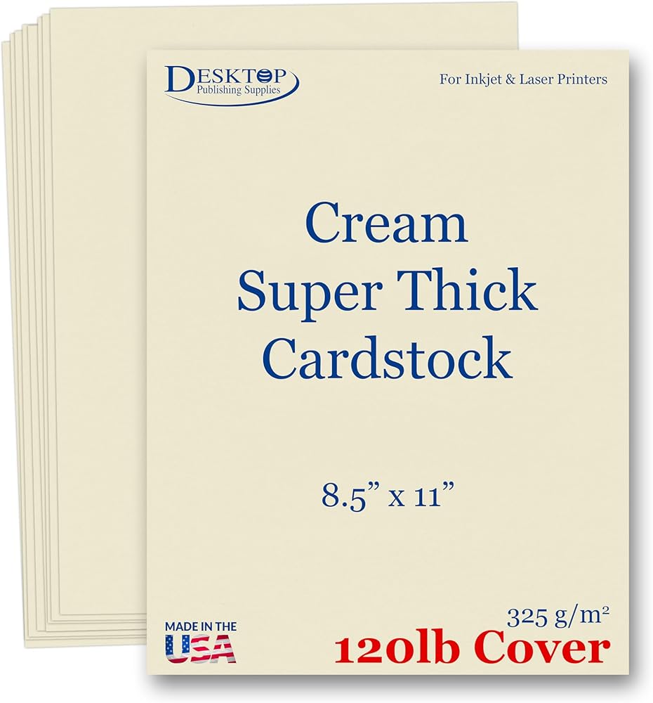 Desktop Publishing Supplies, Inc. brand Ultra Heavyweight SUPER Thick 120lb Cover Natural Cream Cardstock works great for those looking for an impressively thick stock for their invitations, greeting cards, business cards, etc. This 120lb Cover Natural Warm White Cardstock is one of our heaviest cardstock. This stock measures 8 1/2" x 11" and is inkjet and laser printer compatible.