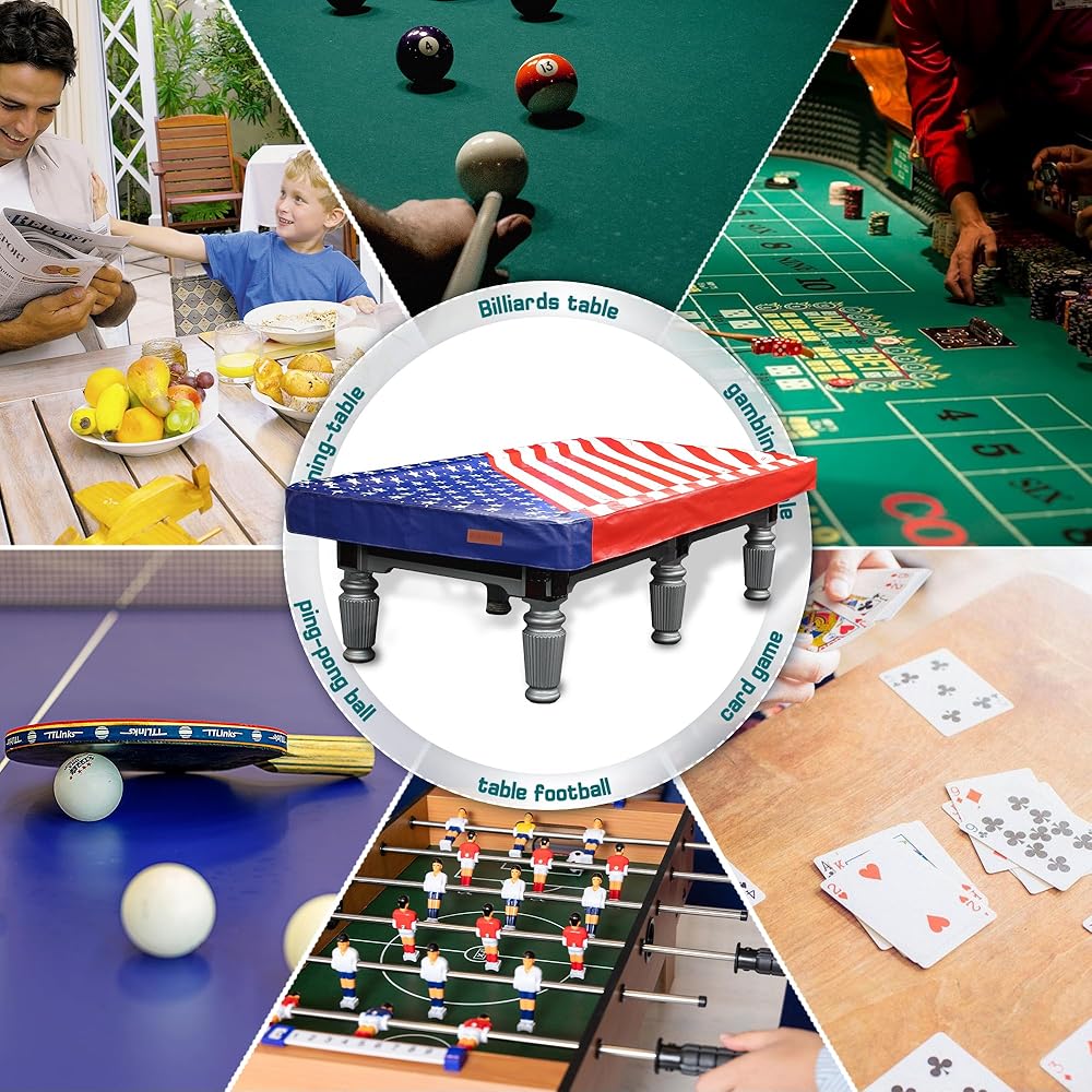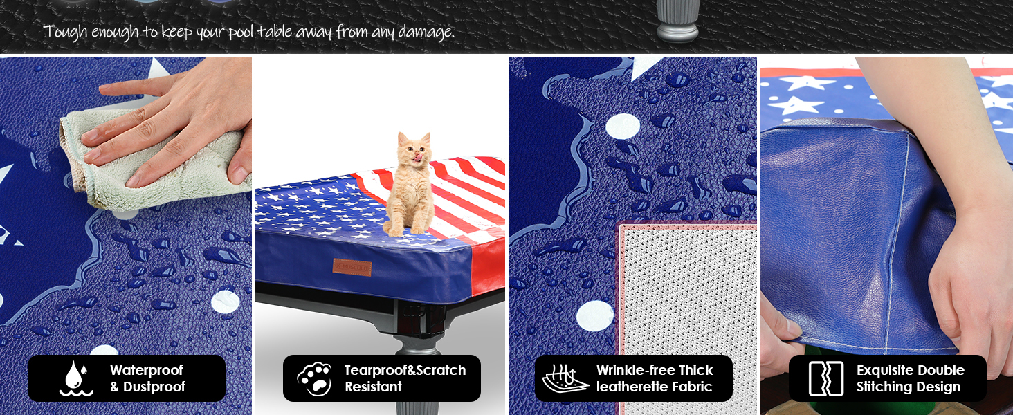 [MATERIAL & WORKMANSHIP]: Heavy duty leatherette pool table covers with weighted corners and machine sewn seams for adding durability. Hight density cotton-fleece backing will keep the cover itself from marking the table. In addition, easy to cover, fold up and store as they are used.