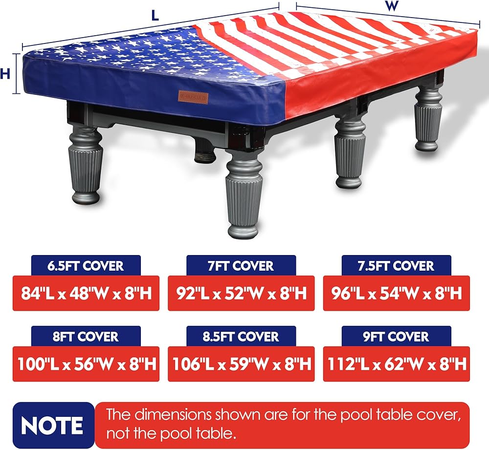 [FITTED SIZE]: The size of the fitted table cover for 8.5 feet table is 106"L×59"W (Edge to Edge). Please be sure to measure your pool table before purchasing the cover. If you're stuck in between sizes or aren't sure which size to buy, we recommend that you choose to go one size up. It also works well for other types of gaming tables.