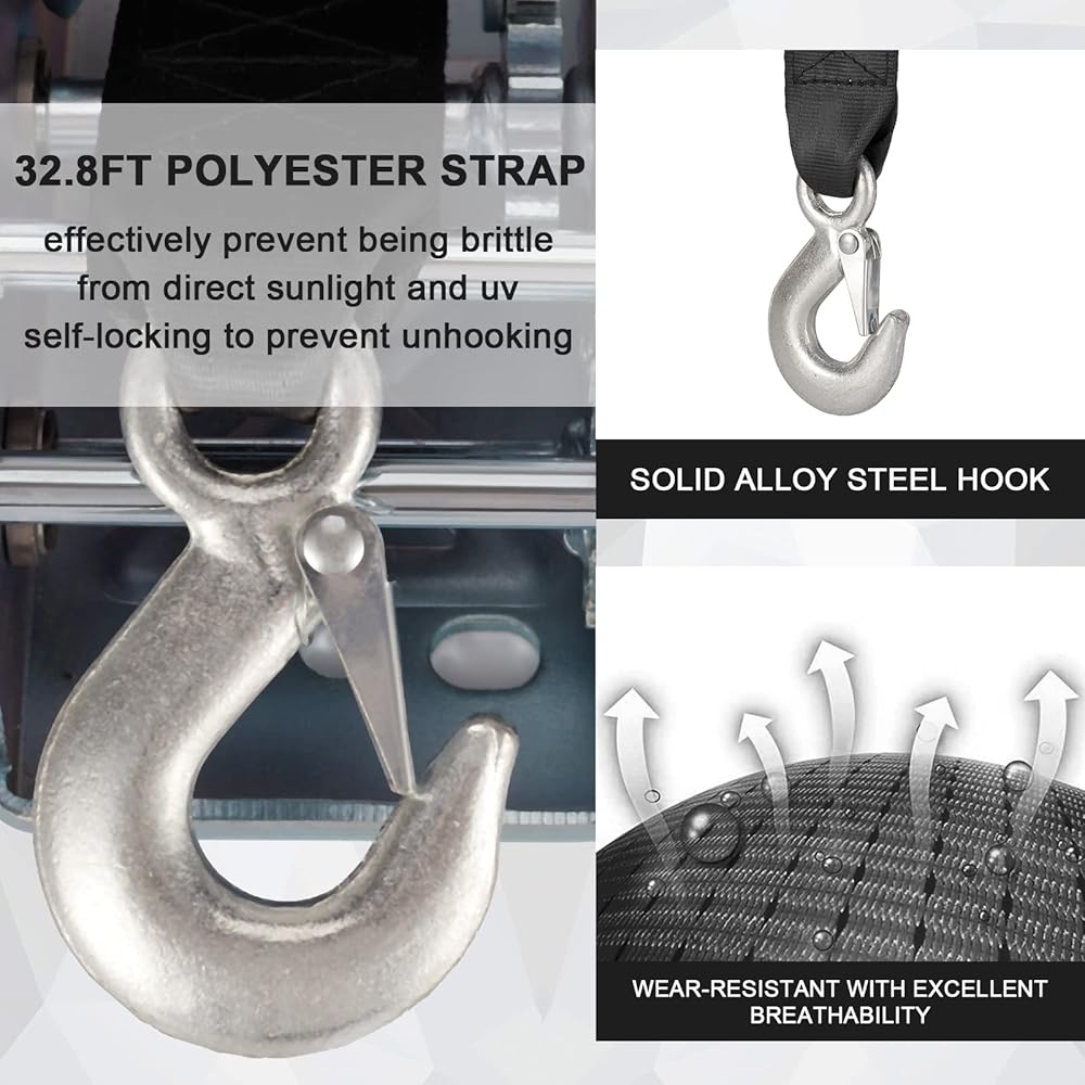 Enhanced Load Capacity: The enhanced load capacity of this heavy-duty boat trailer winch is capable of exerting a pulling force of 3500 lbs,measuring 7.48 inches x 3.93 inches. It features a durable 26 ft long and 2-inch wide black polyester strap. The mounting base. It is lighter than steel wire rope, will not rust.