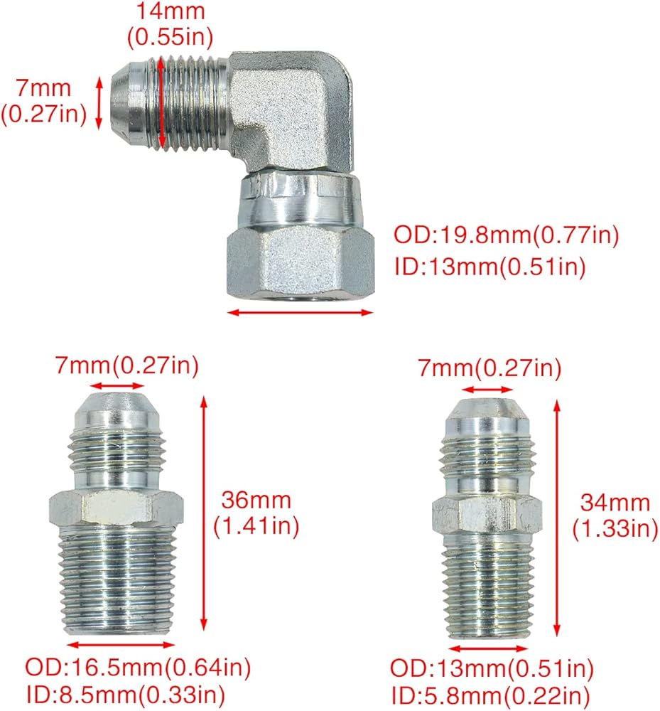 【Package includes】(4) AN-6 flared to 1/4" NPT billet adaptors,(2) AN-6 flared to 3/8" NPT billet adaptors,4) 90 degree AN-6 inverted flare to AN-6 flare billet adaptors,(2) lines in the kit, and each line is about 52".