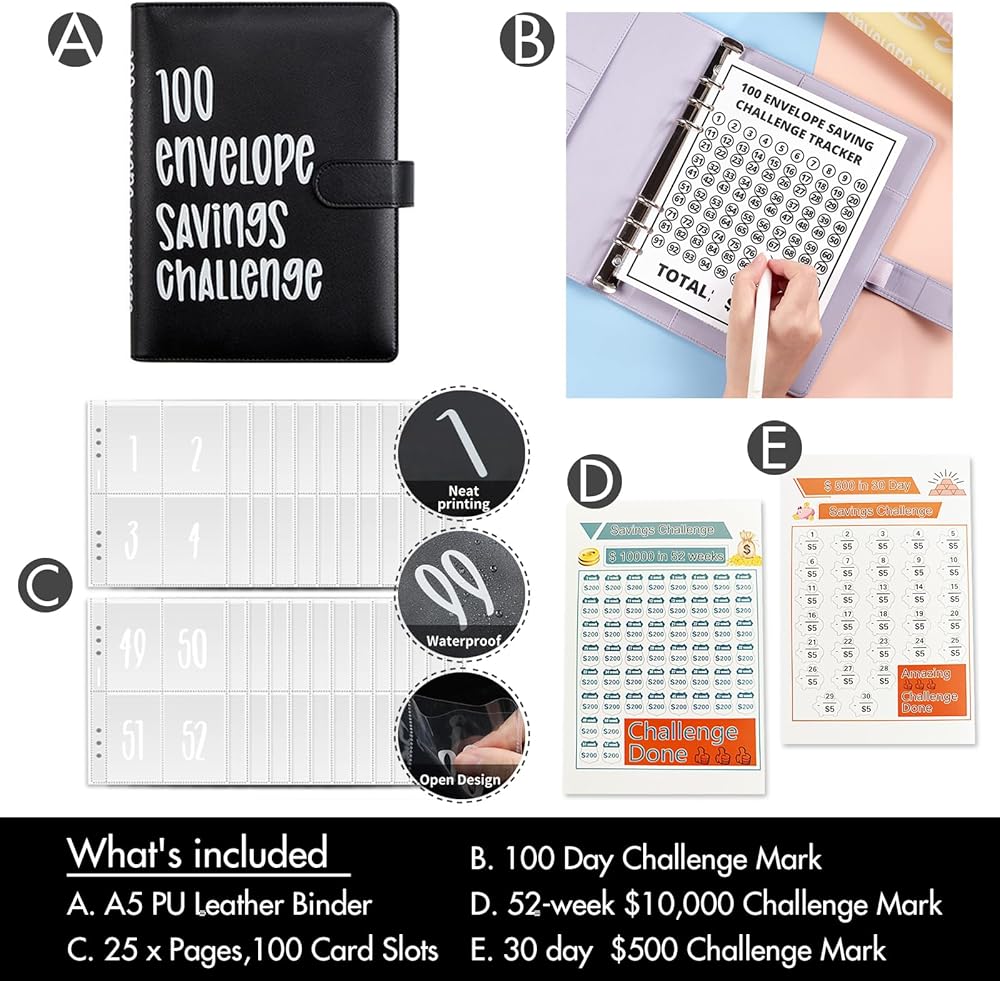 【PERFECT PRACTICAL GIFT】100 Envelopes Money Saving Challenge Binder is the A truly nice gift for all ages to complete the money saving challenge with your family,friend in a more fun way! our 100 Envelopes Money Saving Challenge is the perfect tool to help you save money and reach your financial goals Whether you're a kid or an adult.