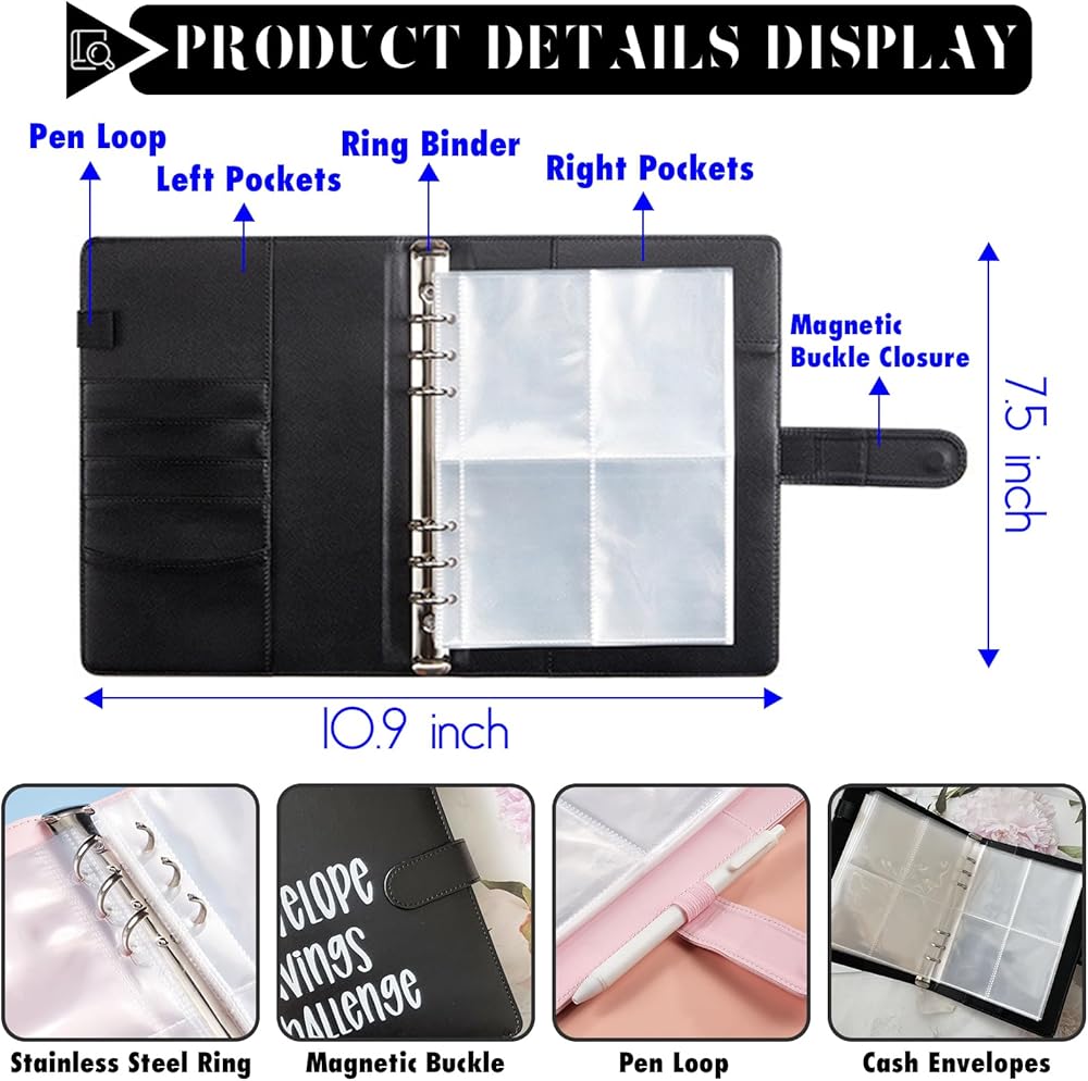 【PREMIUN MATERIAL】High Quality PU leather A5 cash binder is scratch-resistant, neatly stitched and comfortable to the touch. Cash envelopes for budgeting are transparent, waterproof, and will protect your items from water and dust, making them perfect for storing cash, coins, bills, receipts, and other small parts.
