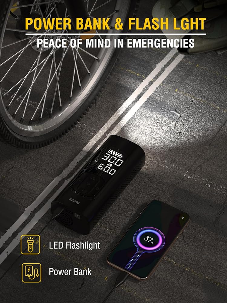 【Emergency Power Bank and Flashlight】: Our bike air pump goes beyond tire inflation—it doubles as an emergency power bank and flashlight. Outfitted with a built-in rechargeable battery, it offers a dependable energy supply for charging your devices during critical moments. Moreover, the incorporated flashlight guarantees visibility and safety in low-light or nighttime conditions.