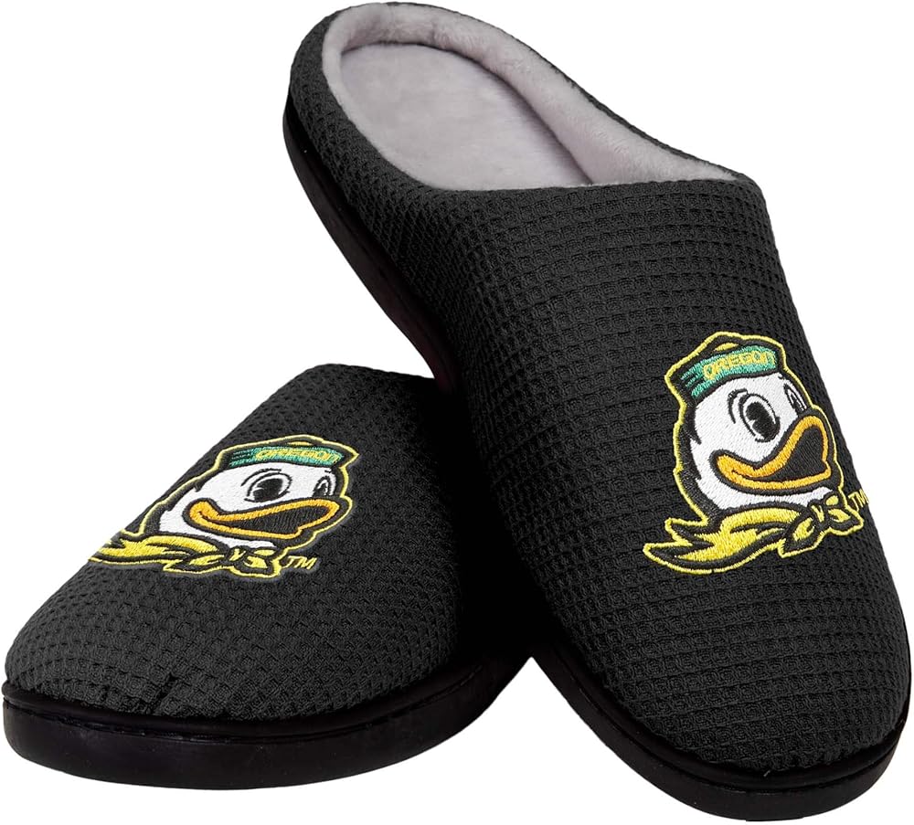- Embroidered team logo display on each slipper