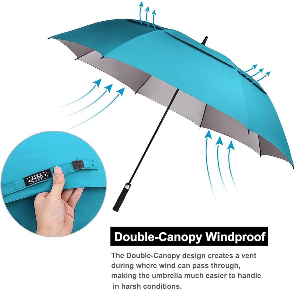 Practical Golf Umbrella: 54 62 68 inch arc, 45 52 59 inch in diameter respectively is big enough to provide protection for 1 to 4 people, the perfect companion for a family outdoors activities; umbrella stands 43.3inch and comes with a matching sleeve for convenient storage.