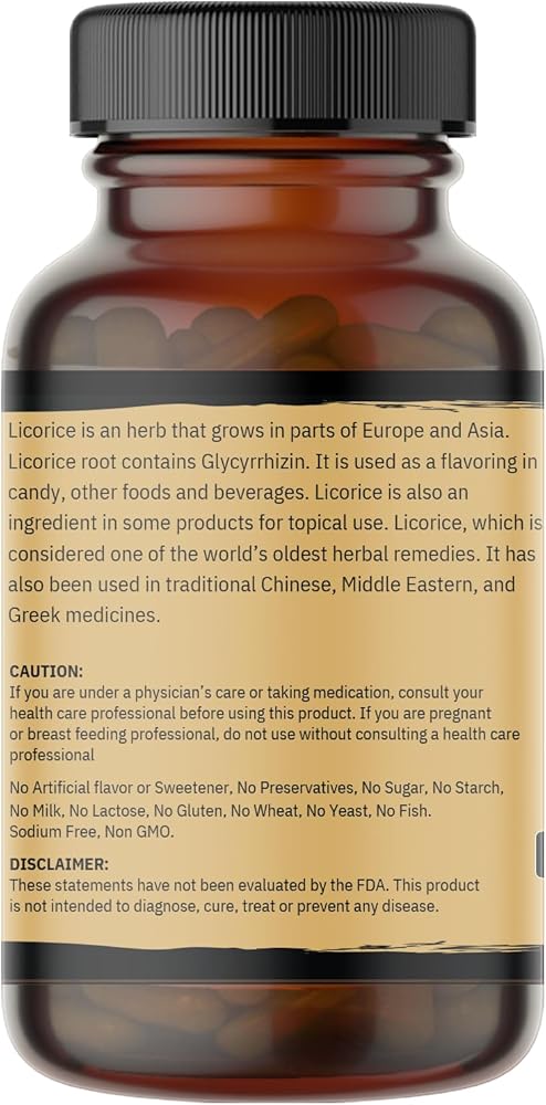 Licorice is an herb that grows in parts of Europe and Asia. Licorice root contains Glycyrrhizin. Licorice is also an ingredient in some products for topical use. Licorice,is considered one of the world's oldest herbal remedies. If you are under a physician's care or taking medication, consult your health care professional before using this product. If you are pregnant or breast feeding professional, do not use without consulting a health care professional No Artificial flavor or Sweetener, No Preservatives, No Sugar, No Starch, No Milk, No Lactose, No Gluten, No Wheat, No Yeast, No Fish. Sodium Free, Non GMO.These statements have not been evaluated by the FDA. This product is not intended to diagnose, cure, treat or prevent any disease.