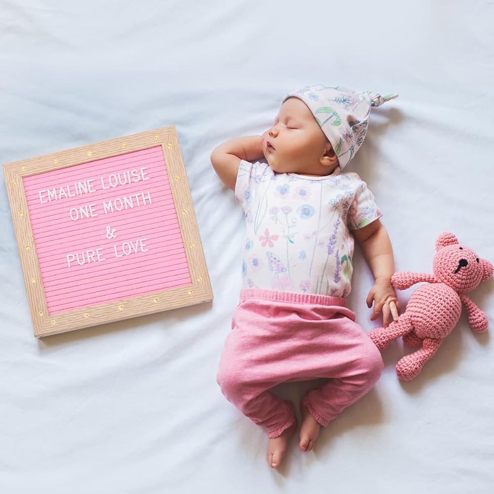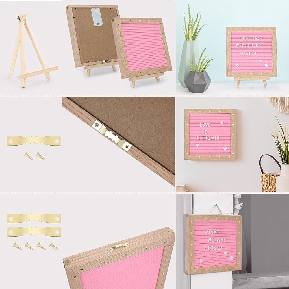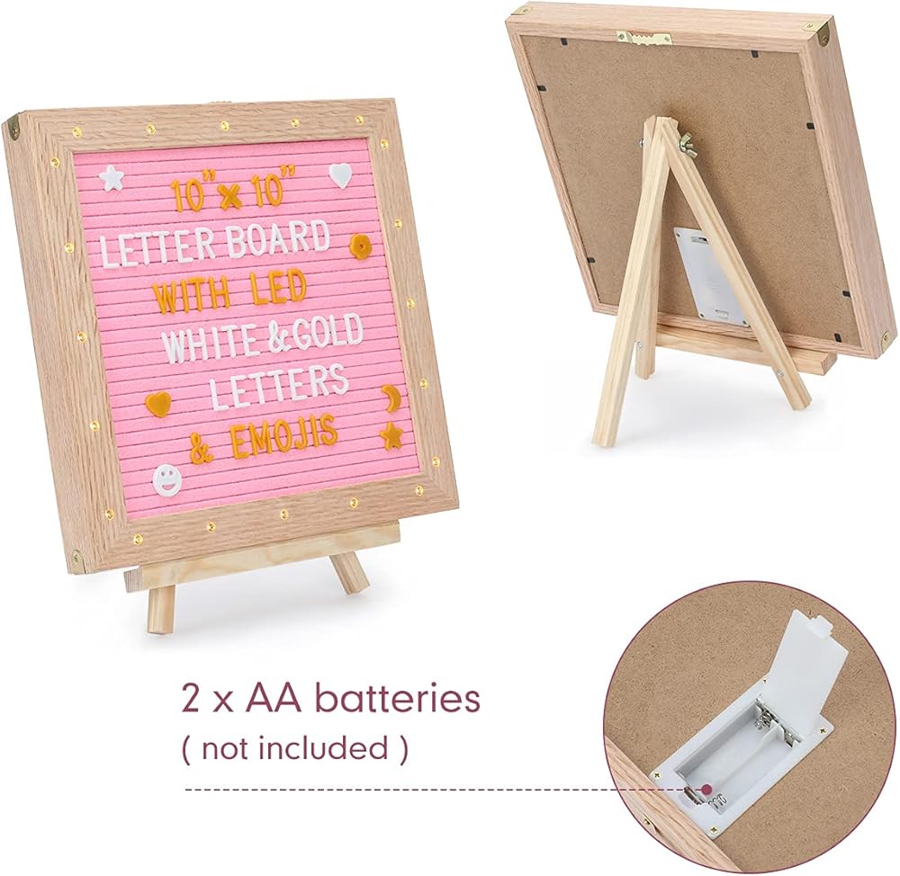 Felt Letter Board with LED Lights for Sign Message, Announcement, Wall Decor -10x10 Inches - Changeable Message Board with Stand, 340 White & 170 Gold Letters & Symbols (Pink)