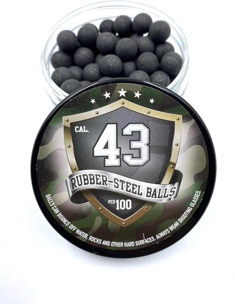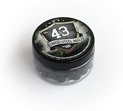 100 x PREMIUM QUALITY RUBBER-STEEL BALLS, PAINTBALLS (43 cal.) for Defense Pistols in 43 caliber / 10.9 mm. Now this product has the exact 43 caliber size. We heard the voice of our customers, adjusted the size and increased the quality even more. Article Details: 100 pcs. hard mix rubber - steel balls for 43 caliber paintball and RAM weapons. These rubber-steel balls also ideal for slingshots. They are made of very strong rubber and they are mixed with steel powder. Due to the very high quality, the rubber-steel balls are super precise and also significantly rounder than comparable balls. One box of Rubber-Steel Balls (100 pieces) in 43 cal. weighs ca. 179 gr. (one single piece weighs around 1,7 gr.) Very good shot and hit picture used on T4E defense pistols. This projectile, weighs heavier than the standard rubber balls and they are dispatched at very high speed. During the impact the ball will receive a violent shock, which will deform it slightly (this is the reason why the balls must in no case be reused). The deformation is small and difficult to see with the naked eye, but present. The major advantage of this type of projectile is that, upon impact, it will cause very significant pain, but will have the advantage of not penetrating the skin, which will allow you to neutralize without injuring your attacker. You still have to aim because this type of projectile can do small damage, especially on furniture or electronic devices (such as a television, computer screen, etc.)