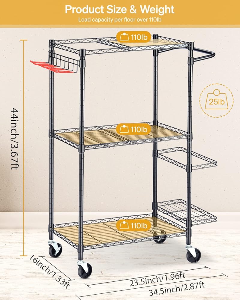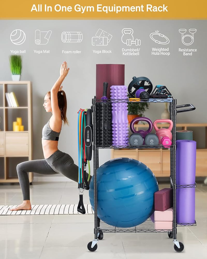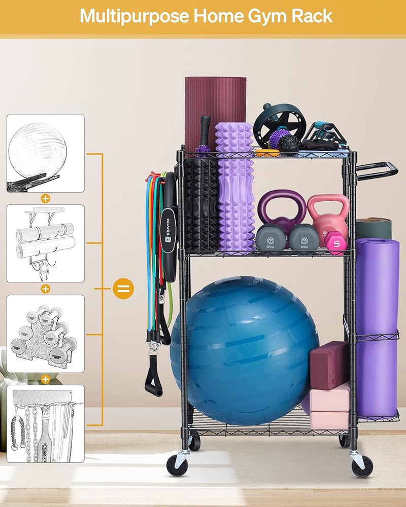 👍【منظم صالة الألعاب الرياضية المنزلي متعدد الوظائف】 تم تجهيز مخزن معدات التمرين بثلاث طبقات من منطقة تخزين شبكية معدنية، وسلة جانبية، وجانب من الخطافات، ومقبض عربة وعجلات متحركة تحمل الحمل مناسبة لهاتفك المحمول. أبعاد منظم التمرين هذا هي 34.5 بوصة (طول) × 16 بوصة (عرض) × 44 بوصة (ارتفاع).