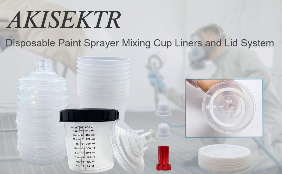 AKISEKTR Disposable Paint Sprayer Mixing Cup Liners and Lid System for HVLP Spray Gun, Car Paint Gun 20oz(600 ml) Kit with 10 Cup Liners, 10 Lids, 10 Filters, 1 Hard Cup with Retainer Ring, 2plugs