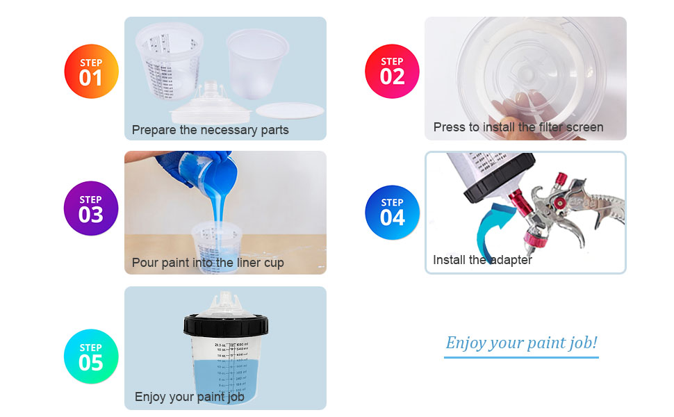 Wide Application: Disposable cup system works excellent with all types of paints, primers, epoxies, and commercial coatings. Ideal for use with automotive paints basecoats, varnishes as well as stains, sealants, gel coatings, polyurethane and enamel.