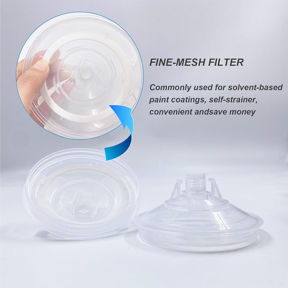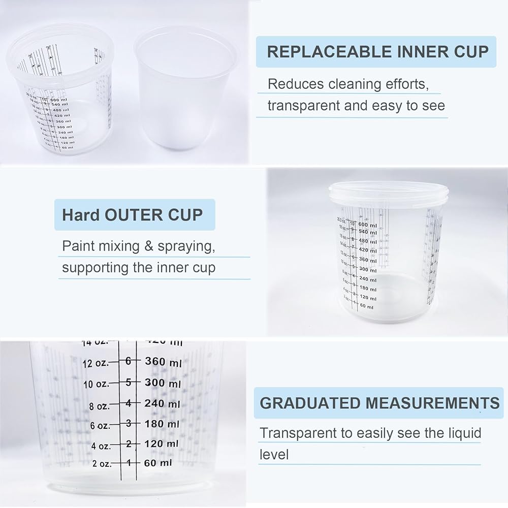 Detachable & Replaceable: The disposable paint cup system is equipped with 10 sets of lids, liners, and filter screens, including 1 hard graduated outer cup and 1 black fixing ring, making it easy to install, disassemble, and replace.