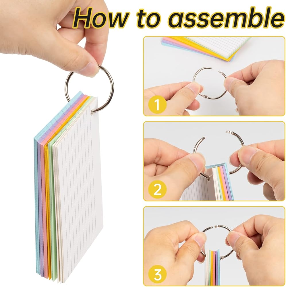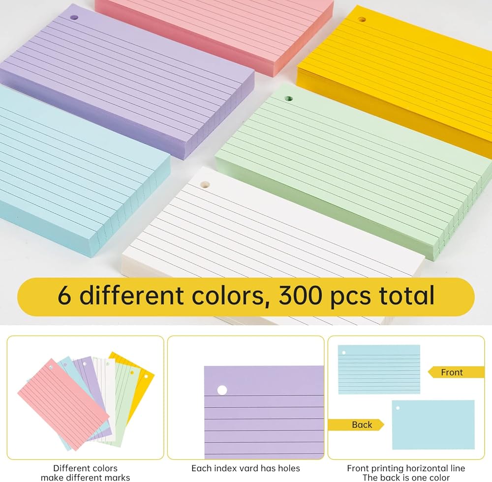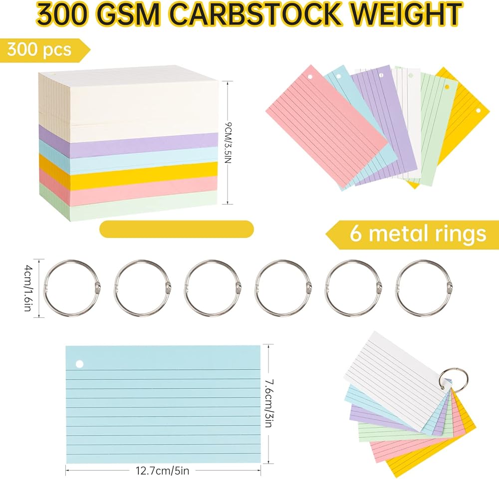 Index Cards, 300 PCS 3 x 5 Inch Punched Flash Cards with 6 Metal Binder Rings, Assorted Colored Flashcards for Studying, Ruled Note Cards for Adults Kids Home School Office