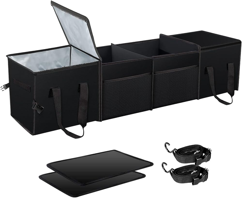 X-cosrack Insulated Car Trunk organizer, Collapsible Car Storage Organizer with 2 Cooler Bag and Lid for SUV, Jeep, Car Accessory with Mesh Pocket and Securing Strap for Grocery, 4 Compartment, Black