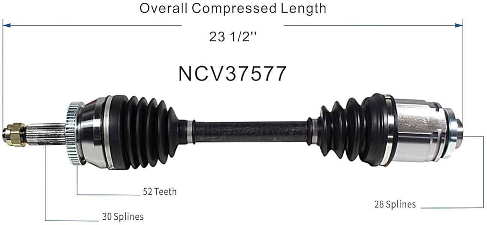 • Right Front (Passenger Side); 23-1/2 inch compressed length; 30 spline outer joint; 28 spline inner joint; 52 tooth ABS ring