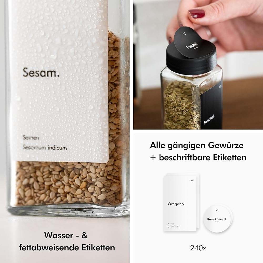 WATERPROOF LABELS - The labels are waterproof and oil-resistant. This means that the spice jars can be easily cleaned by hand and are very suitable for everyday use.