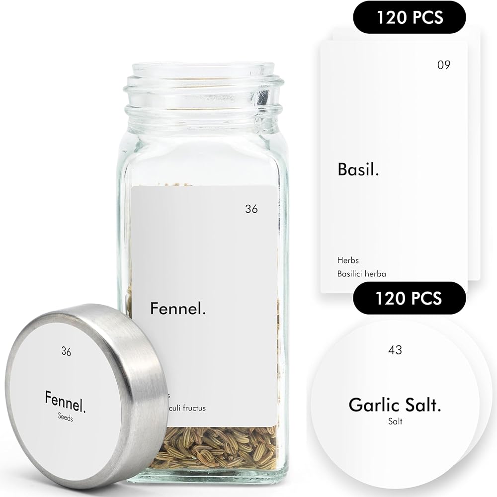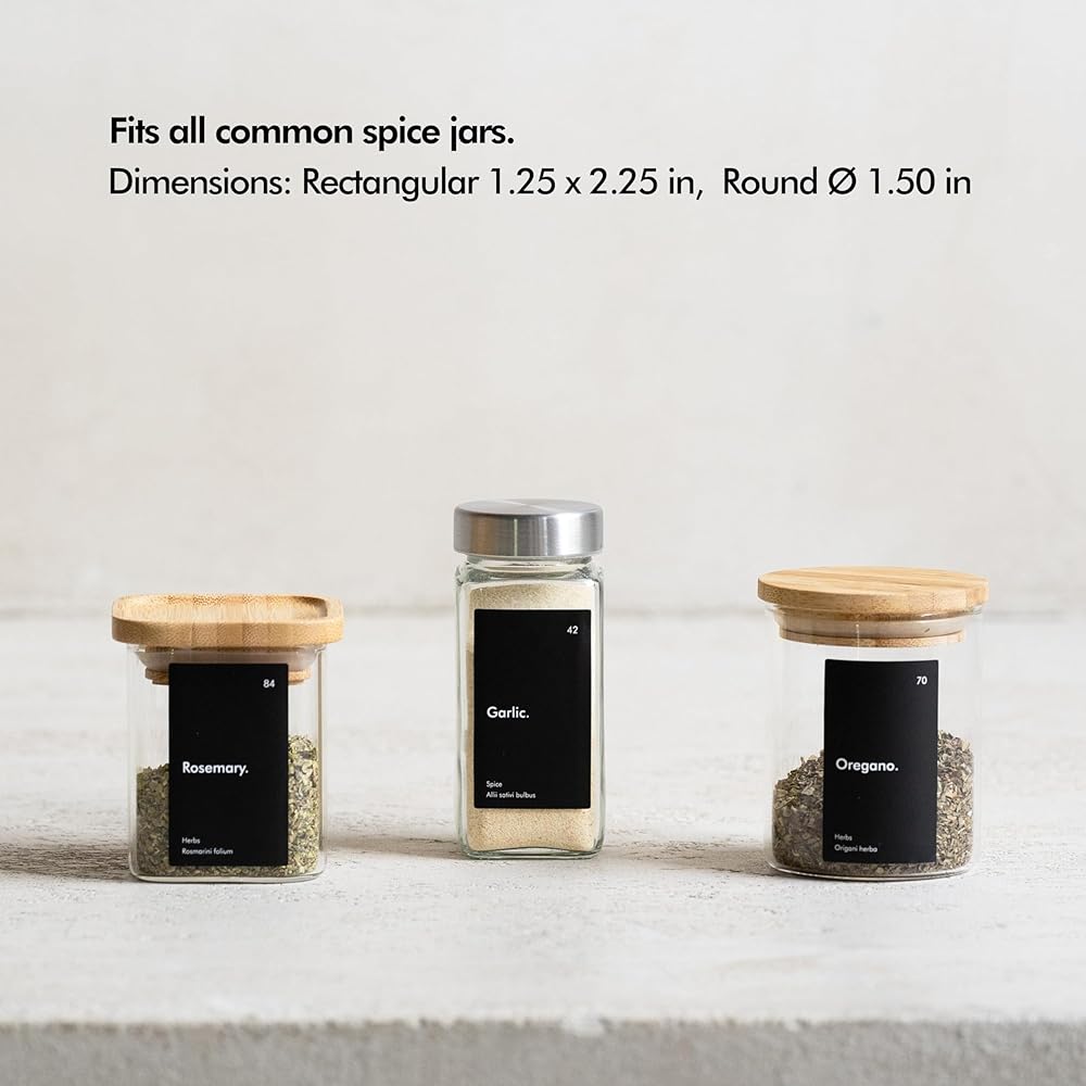 DETAILS - Scope of delivery: 200 self-adhesive spice labels stickers, Dimensions: Rectangular 1.25 x 2.25 in, Round Ø 1.50 in