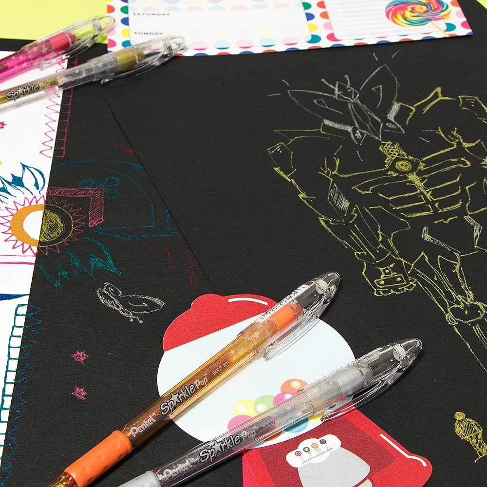 The Pentel Sparkle Pop gel pens add a unique “POP beauty” of color to your writing world. New sparkling iridescent ink changes color when writing on black or white paper to make your writing and artwork stand out. Smooth metallic gel ink and extra-long balanced barrel for effortless writing and control. Latex-free grip for comfortable writing and drawing. 1. 0mm metal tip writes bold lines. Ap certified. Backed by a limited lifetime.