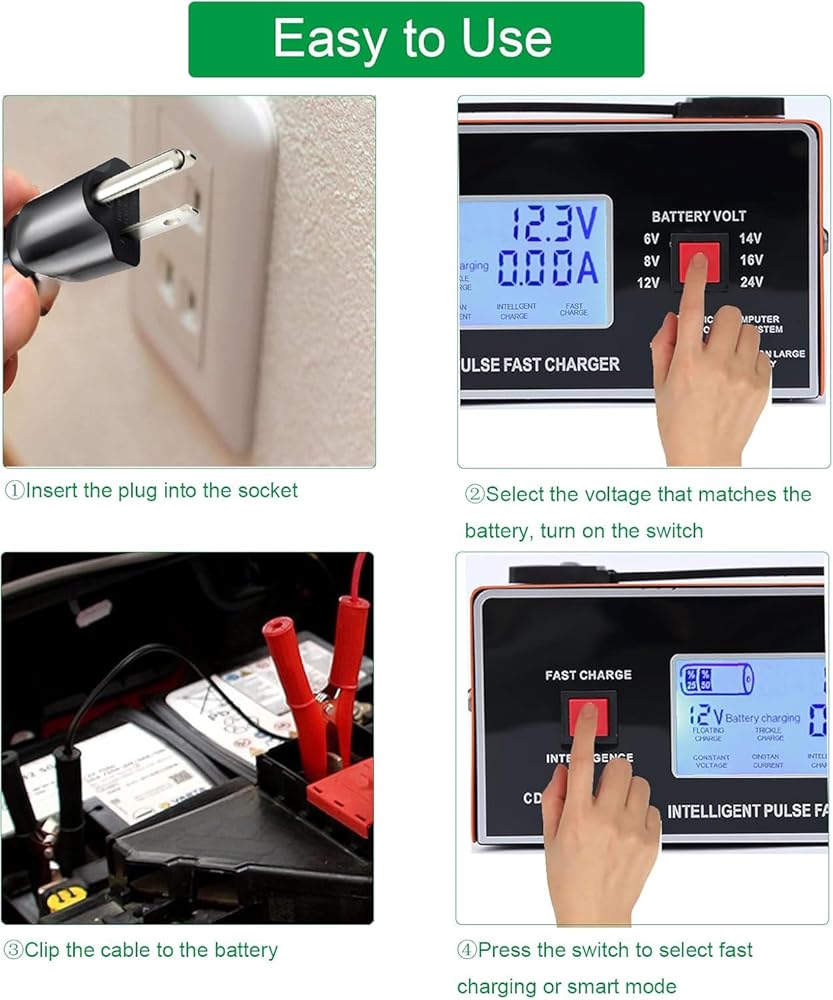 【WIDELY COMPATIBLE】-Suitable for charging and maintaining various types of 6-24V lead-acid batteries (excluding lithium batteries); Compatible with all types of vehicles, charging and maintaining cars, golf carts, motorcycles, boats, lawn tractors, vans, trucks , classic cars, ATV, SUV, PWC, etc. Carrying handle is very convenient to carry.