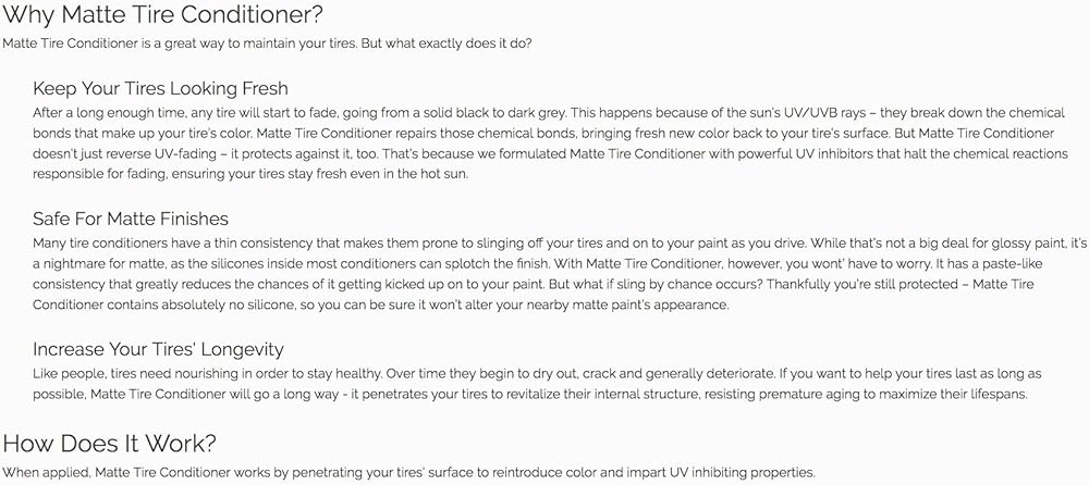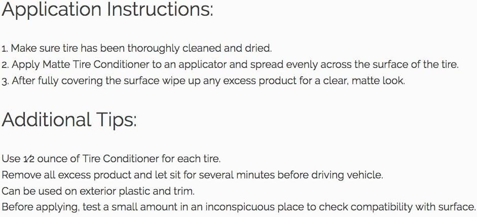 Matte Tire Conditioner is formulated to restore faded tires and protect from future UV damage. This silicone free formula was specifically designed for vehicles with matte paint, matte wraps, and matte wheels. Get your tires back to black without worrying about damage to your finish.