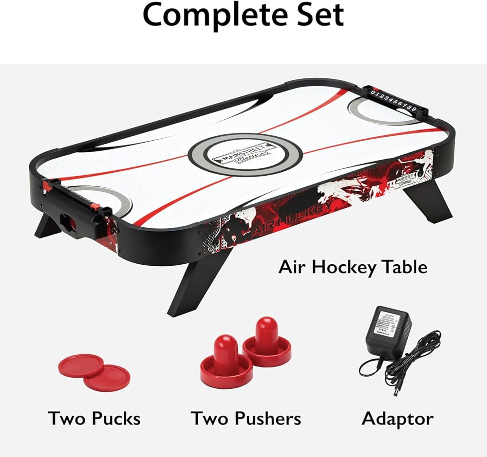 The Mainstreet Classics 22-Inch Table Top Air Hockey Game can supply all the fun of air hockey, without taking up the majority of a game room with an expensive table. The compactness of the table enables easy storage and portability for condensed fun anywhere with a table or flat surface. As the air is powered by eight AA batteries, this table topper is perfect for on-the-go play as there is no need for an outlet. The Mainstreet Classics 22-Inch Table Top Air Hockey Game includes two pucks, two pushers (mallets), and two sliding scorers for scorekeeping. Dimensions: 22" L x 12-1/2" W x 4" D. Powered by eight AA batteries that are not included with purchase.