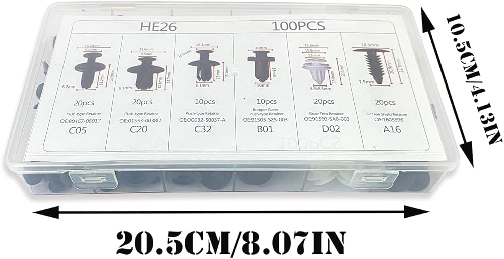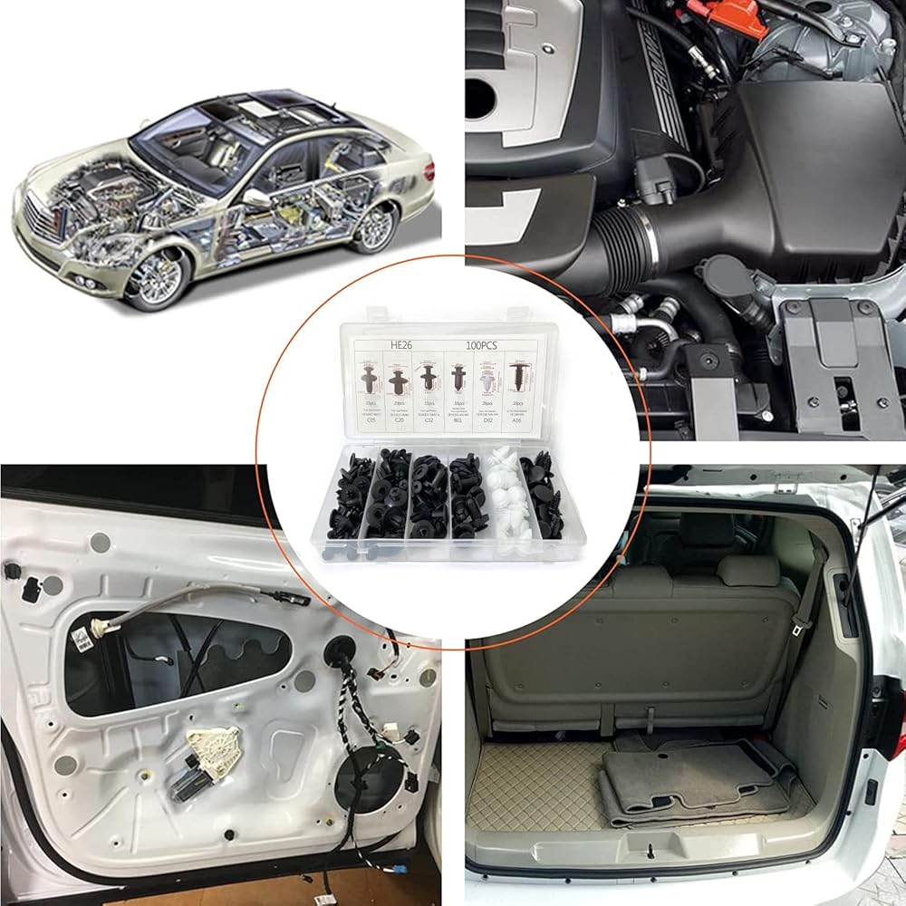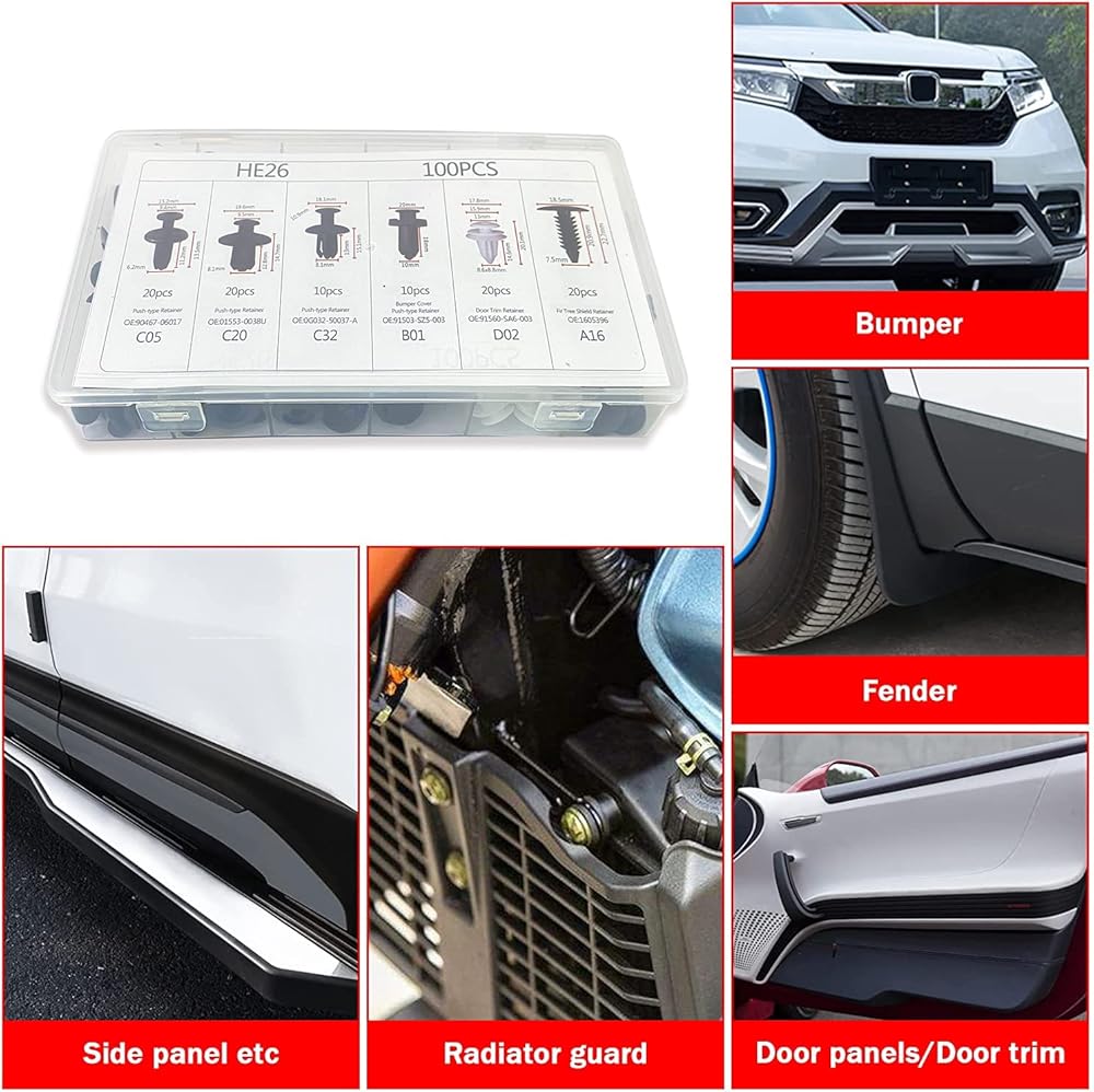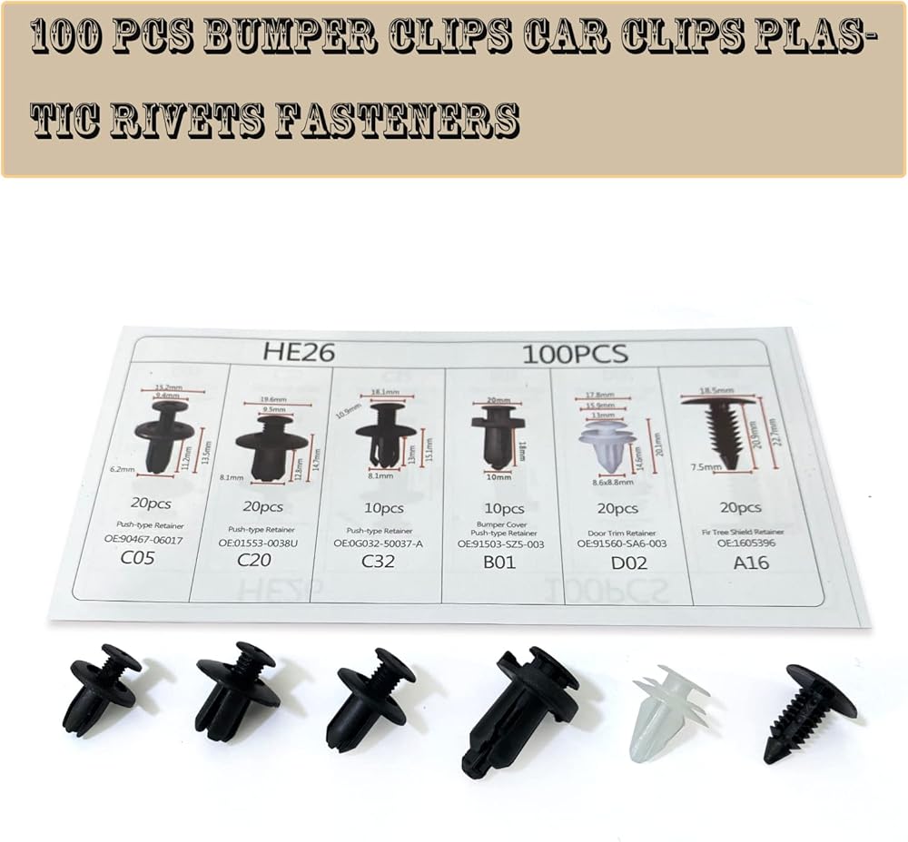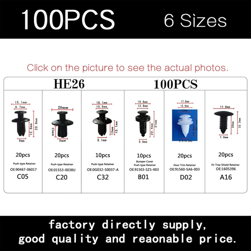 100 Pcs Bumper Clips Car Clips Plastic Rivets Fasteners Push Retainer Kit This push retainer set has 6 common sizes Made of high-quality heavy-duty material for durability Widely Used:Fender,Door,Bumper,Trim panel and more;it also can work on some applications like motor vehicles,Furniture and electronic equipments.