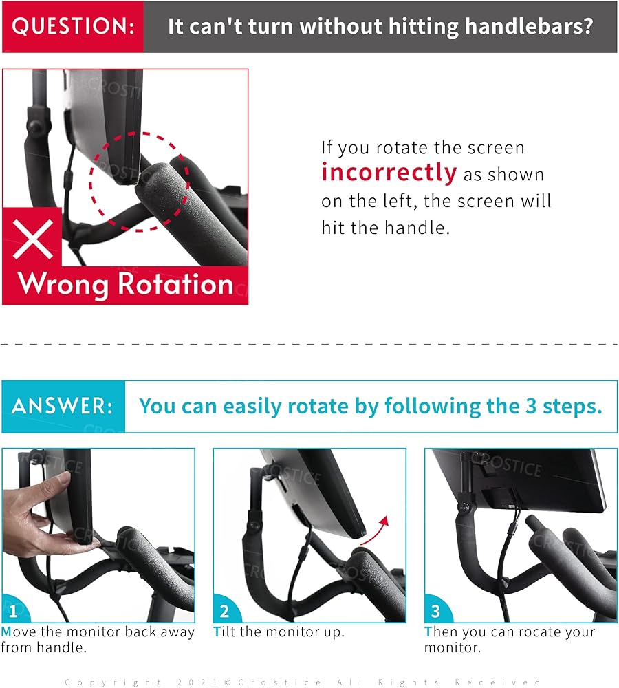 【Upgraded proprietary design】The upgraded version of Crostice is the most suitable swivel adapter for original bike manufactured after many improvements and tests, without any damage to the bike. 1. We designed a more precise matching lock nut for the pivot to make it more stable on the screen. 2. Many other pivot on the market are not long enough to rocate the screen. We have increased the height of the swivel, which is more conducive to the easy rotation of the screen.