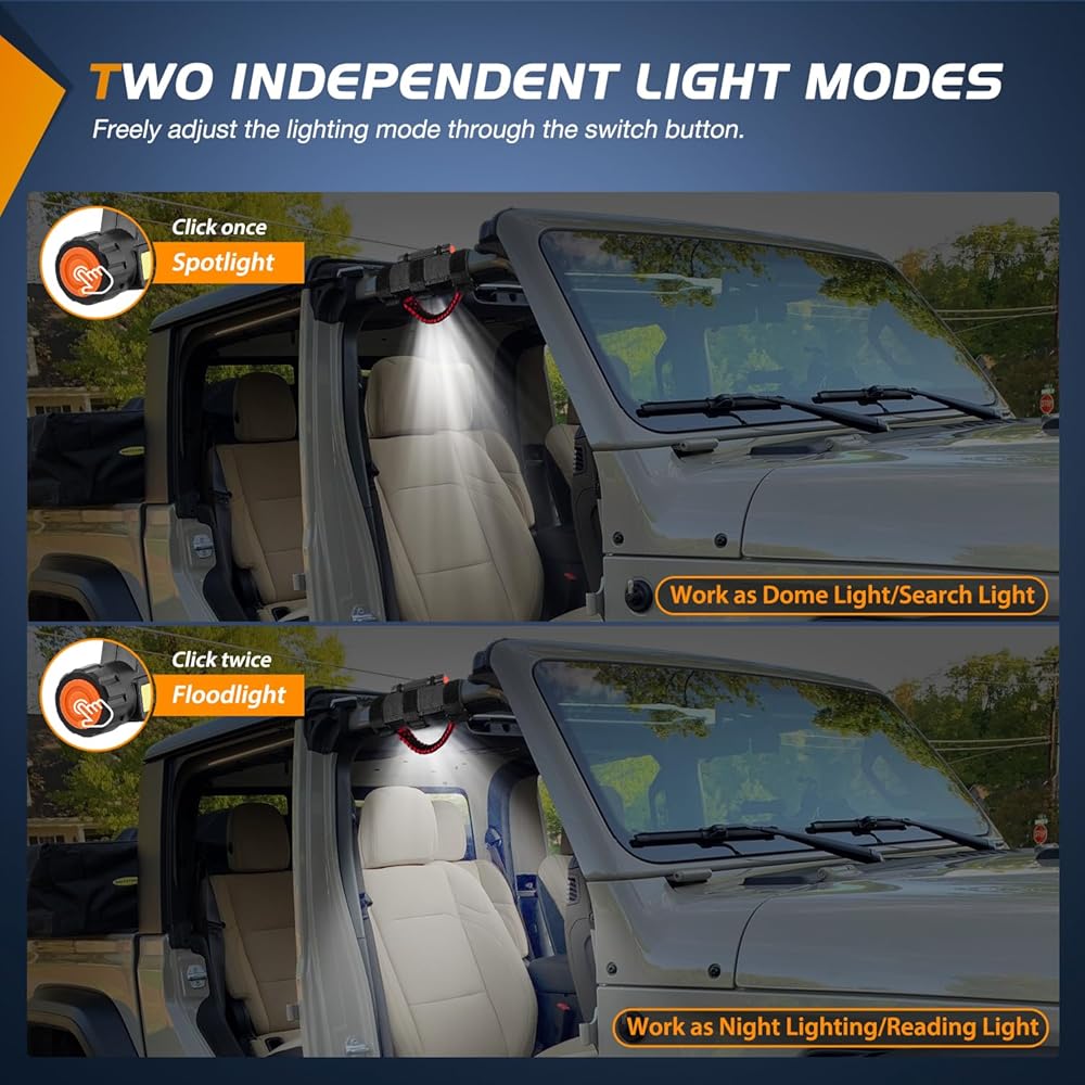 Two Installation Methods: Easily and firmly mounted on 1.5-2.0inch roll bar by Velcro tape, adjustable within 90°. Or the light can be adsorbed on ironwork surface with strong magnetic base, light up anywhere you want.