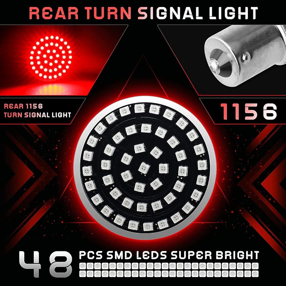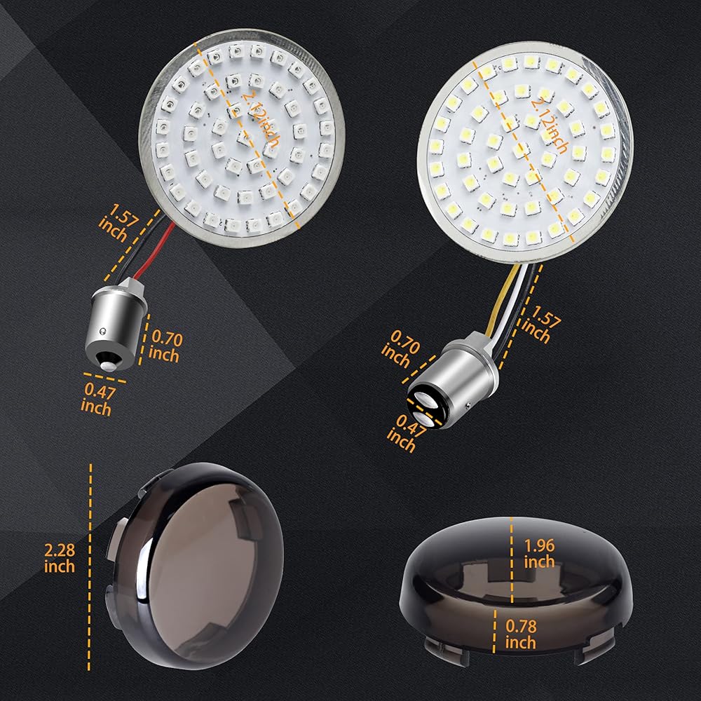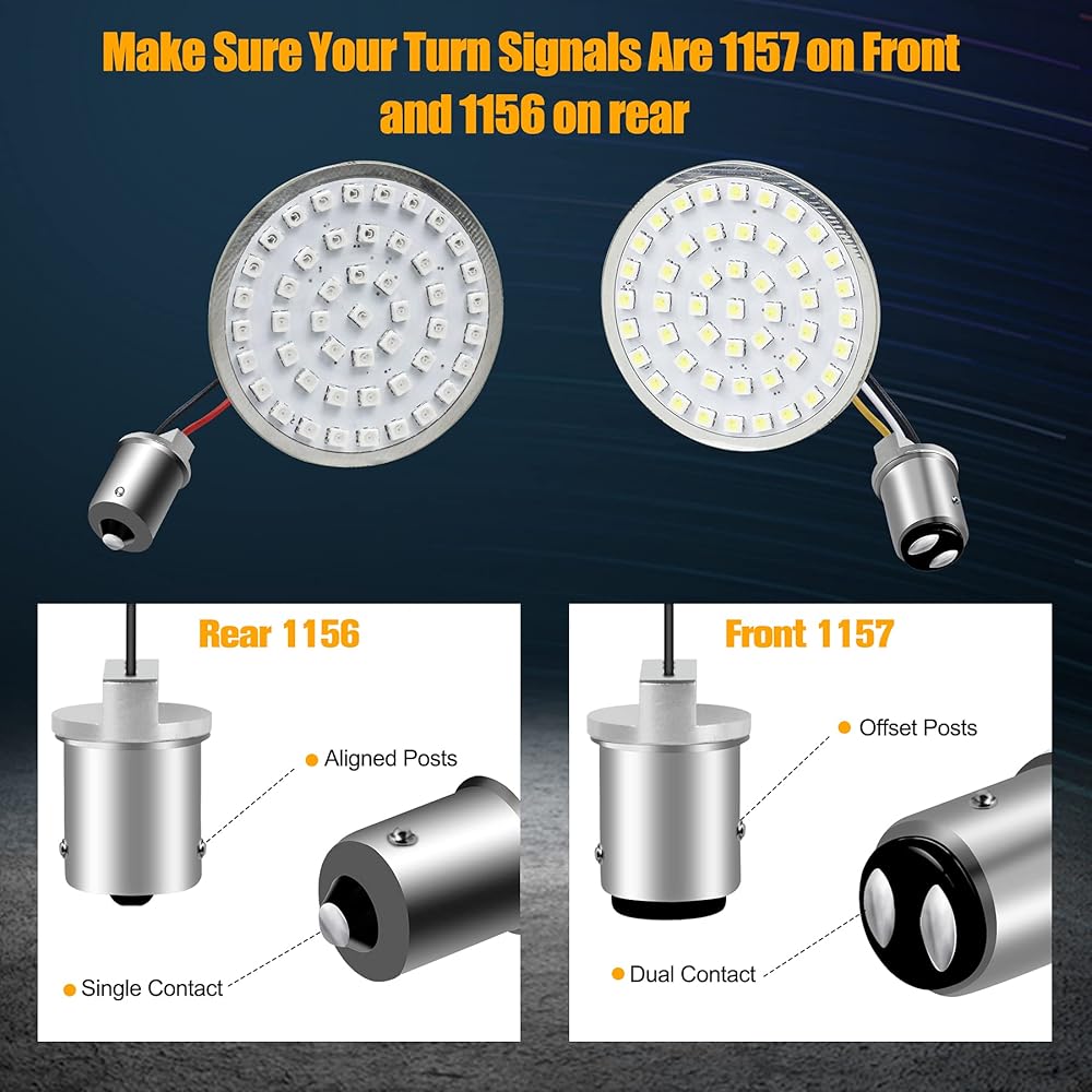 ➤ Compatibility: Fit for all motorcycle with 2 inch 1157 front and 1156 rear bullet turn signal housing base. Such as compatible with Harley Dyna, Street Glide, Fat Boy, Softail, Road King, Springer. Please make sure your original front light bulb is 1157 and rear light is 1156 before ordering