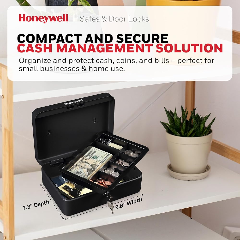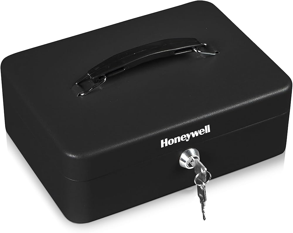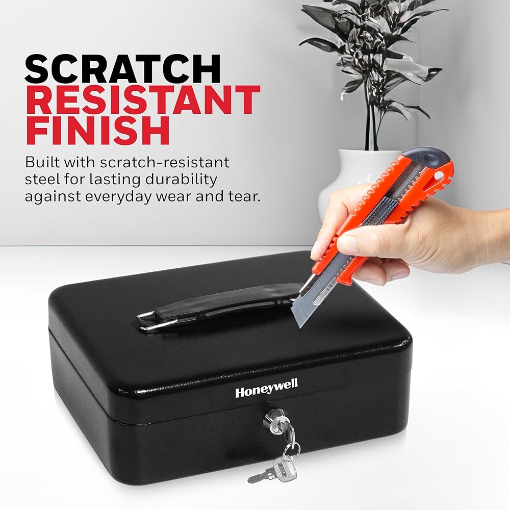 The Honeywell model 6112TL standard steel cash box is a great choice for businesses of all sizes. It is made of durable steel and has a scratch-resistant powder coat finish. It features a removable cash tray with 1 bill and 5 coin slots, a key lock for security, additional storage under the tray, and a convenient carry handle. It is also backed by a 1 year limited warranty.