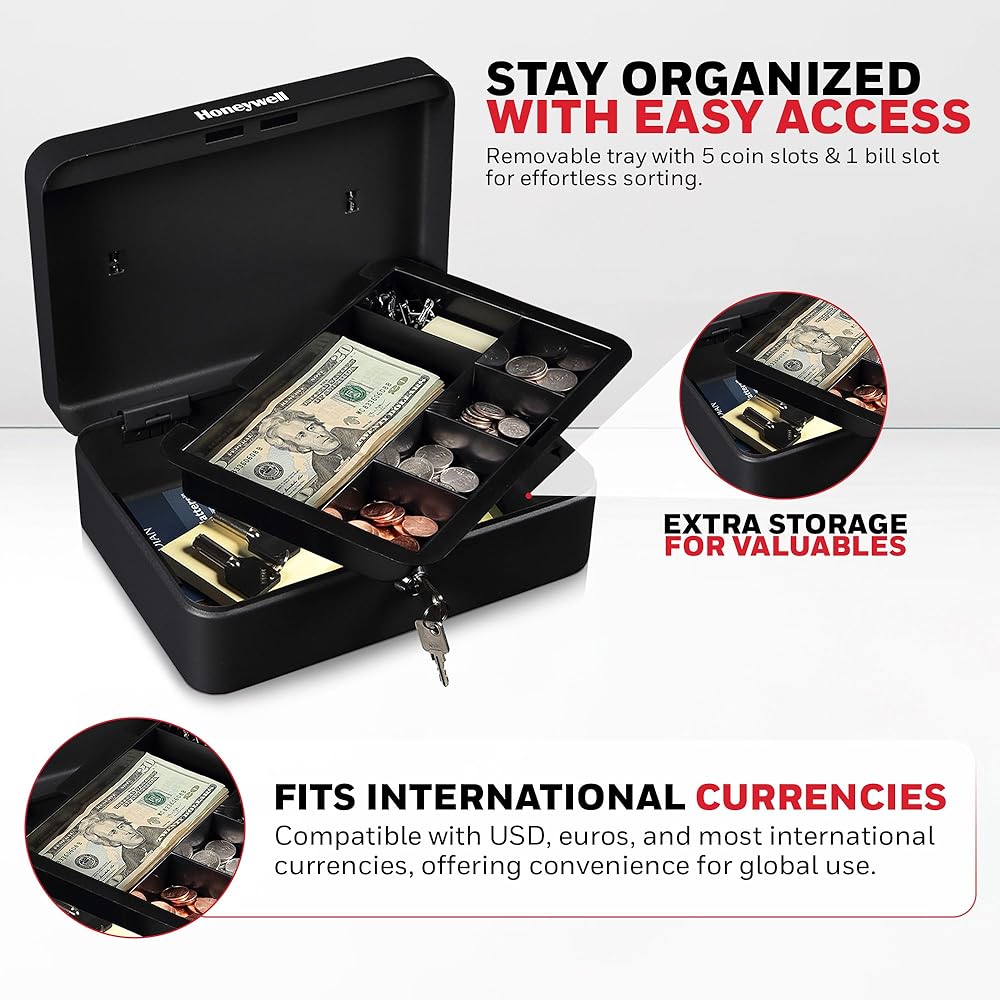 Convenience: The cash box has a removable cash tray with 1 bill and 5 coin slots, making it easy to store and retrieve cash. It also has additional storage under the tray, perfect for storing receipts or other small items.