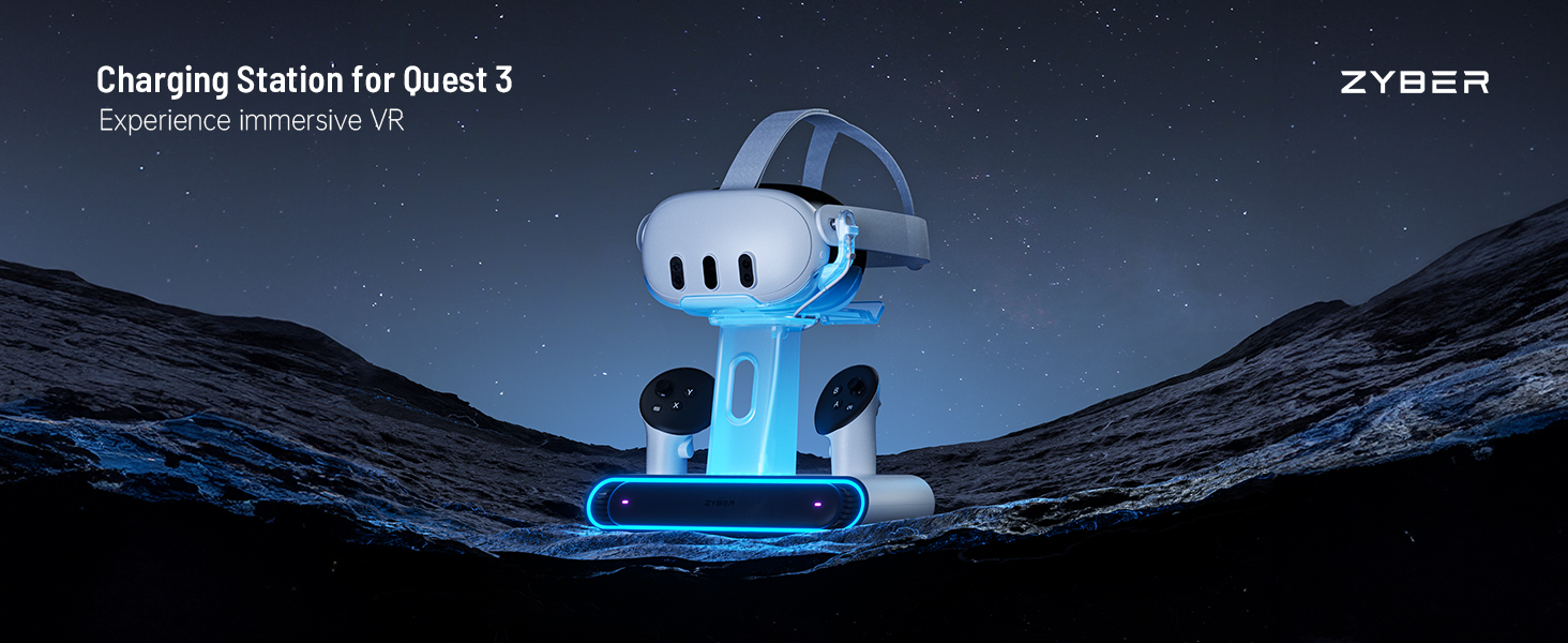 ZYBER RGB Charging Dock for Meta Quest 3, Fast Charging Station with 2 Rechargeable Batteries for Oculus Quest 3 Accessories, VR Headset Holder Stand & Controller Mount