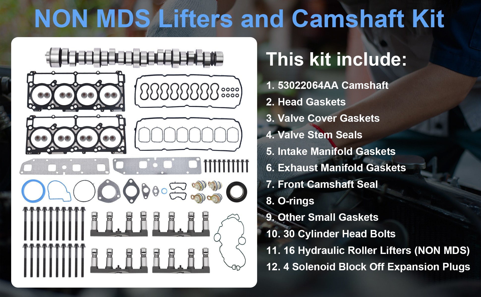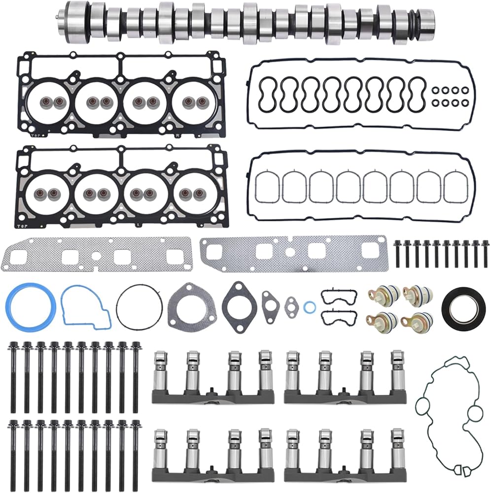 Head gasket kit include: camshaft, 16 non mds valve lifters, head gasket, valve cover gasket, valve stem seals, intake & exhaust manifold gasket, front camshaft seal, o-rings, other small gaskets, 30 cylinder head bolts, expansion plugs