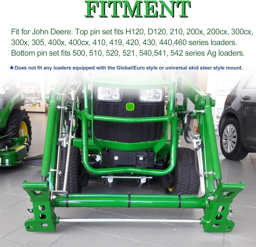 Fitment: Front Loader Brackets Fit for John Deere. Top pin set fits H120, D120, 210, 200x, 200cx, 300cx, 300x, 305, 400x, 400cx, 410, 419, 420, 430, 440, 460 series loaders. Bottom pin set fits 500, 510, 520, 521, 540, 541, 542 series Ag loaders.Does not fit any loaders equipped with the Global/Euro style or universal skid steer style mount.