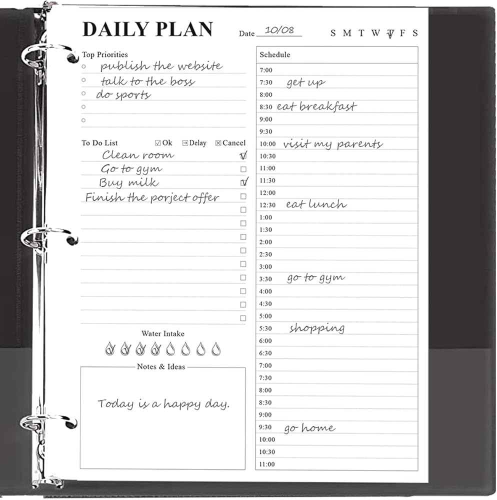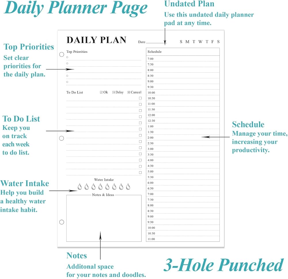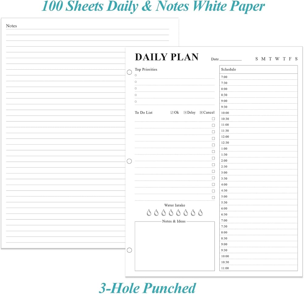 This daily planner refill is undated, size of 8.5" x 11", you can start using it at any time without wasting a page. This refill planner with 100 sheets/200 pages for 200 days. with standar 3-holes inserts, refill paper for standar 7-holes/3-holes inserts, refill paper for A4 binder, Size 5, Folio Size etc, DON'T fit 6 ring binders. The daily refill paper is used to high quality 100gsm pure white premium acid-free paper, so you can confidently use most pens, pencils, and markers without ghosting and bleed-through.day planner refill page includes space for 5 top priorities, 13 to do list, daily schedule from 6am-11pm, notes&ideas and water intake. This to do list planner refill con help you to save time and achieve your goals.
