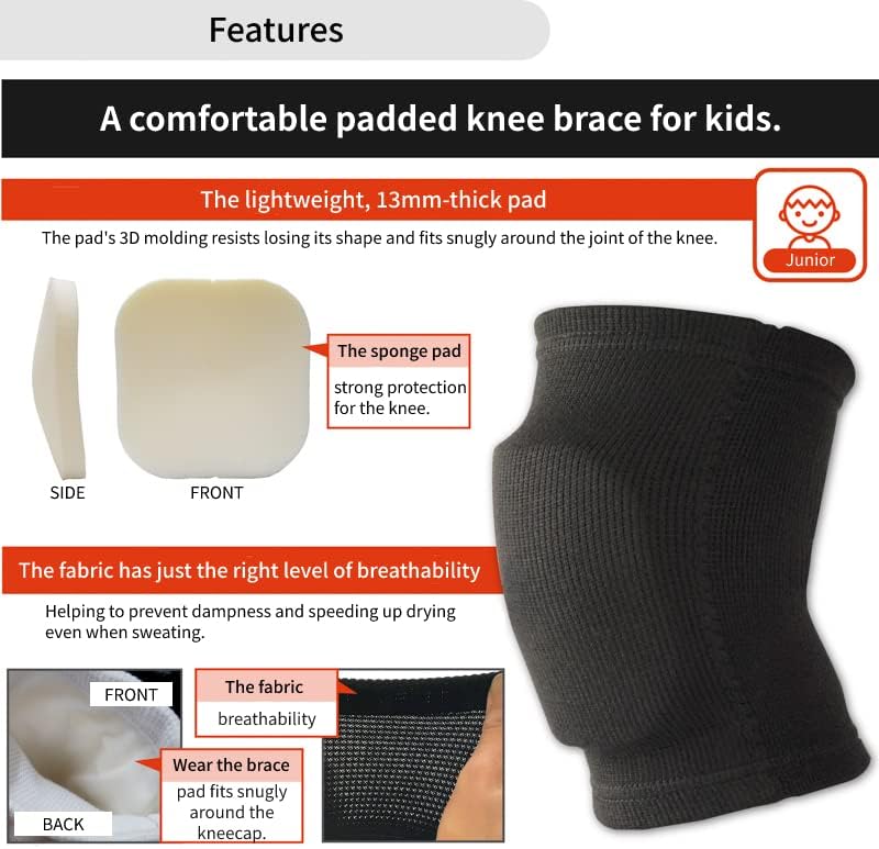 ▼ Features of this knee brace for volleyball This knee brace has thick padding for peace of mind. It is a kids' version of one of our longtime bestsellers, #837. (1) The sponge padding combines shock absorption and cushioning to provide strong protection for the knee. (2) The pad's 3D molding resists losing its shape and fits snugly around the joint of the knee. (3) The fabric has just the right level of breathability, helping to prevent dampness and speeding up drying even when sweating.