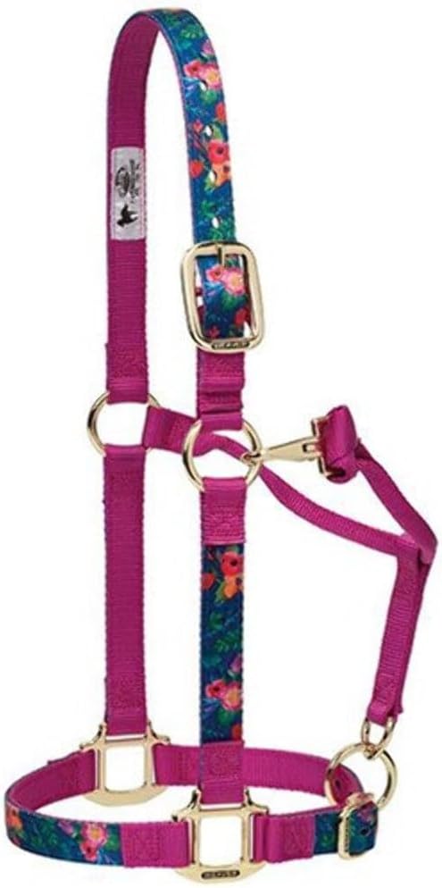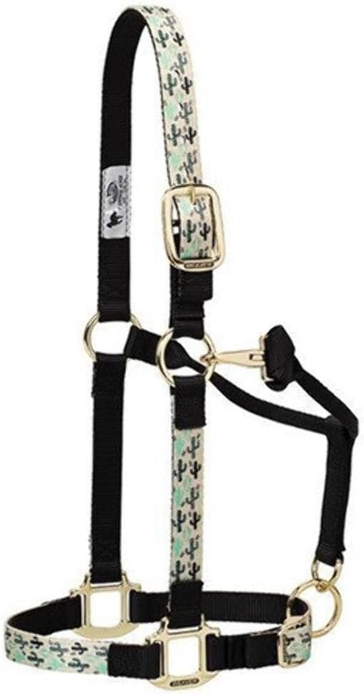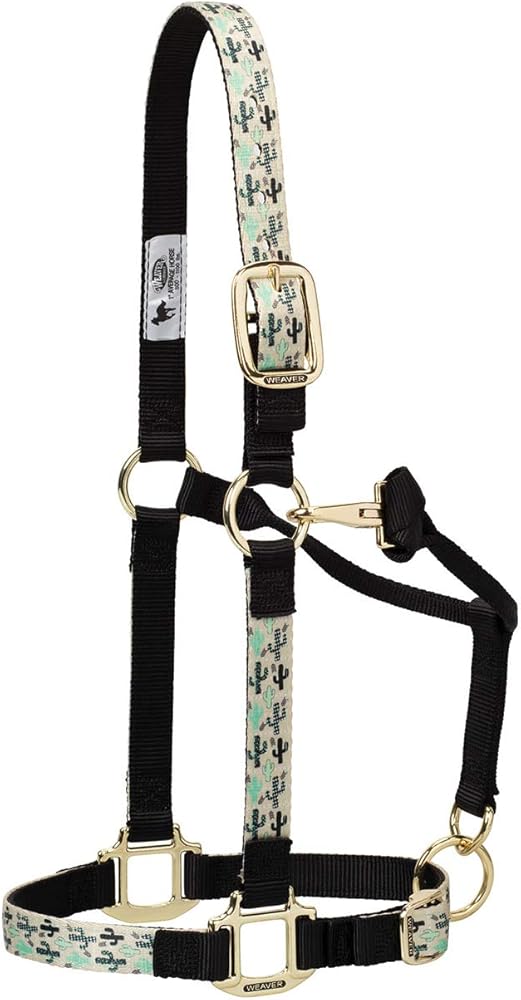 Weaver Leather(R) Patterned Adjustable Nylon Halter With Snap Fashion-Forward designs combined with the finest materials make this Patterned Adjustable Halter a must-have! Fashionable patterned webbing pairs with coordinating solid webbing to give these vibrant nylon halters lots of style. Features: Top quality nylon Oblong buckle holes Adjustable chin and throat Box stitching at stress points for strength and heat sealed edges Comfortable rolled throat for the ultimate in performance and value Item Specifications: Sizes: Small: 500-800 lbs. Average: 800-1,100 lbs. Large: 1,100-1,600 lbs. Please see Size Chart for specific measurements.