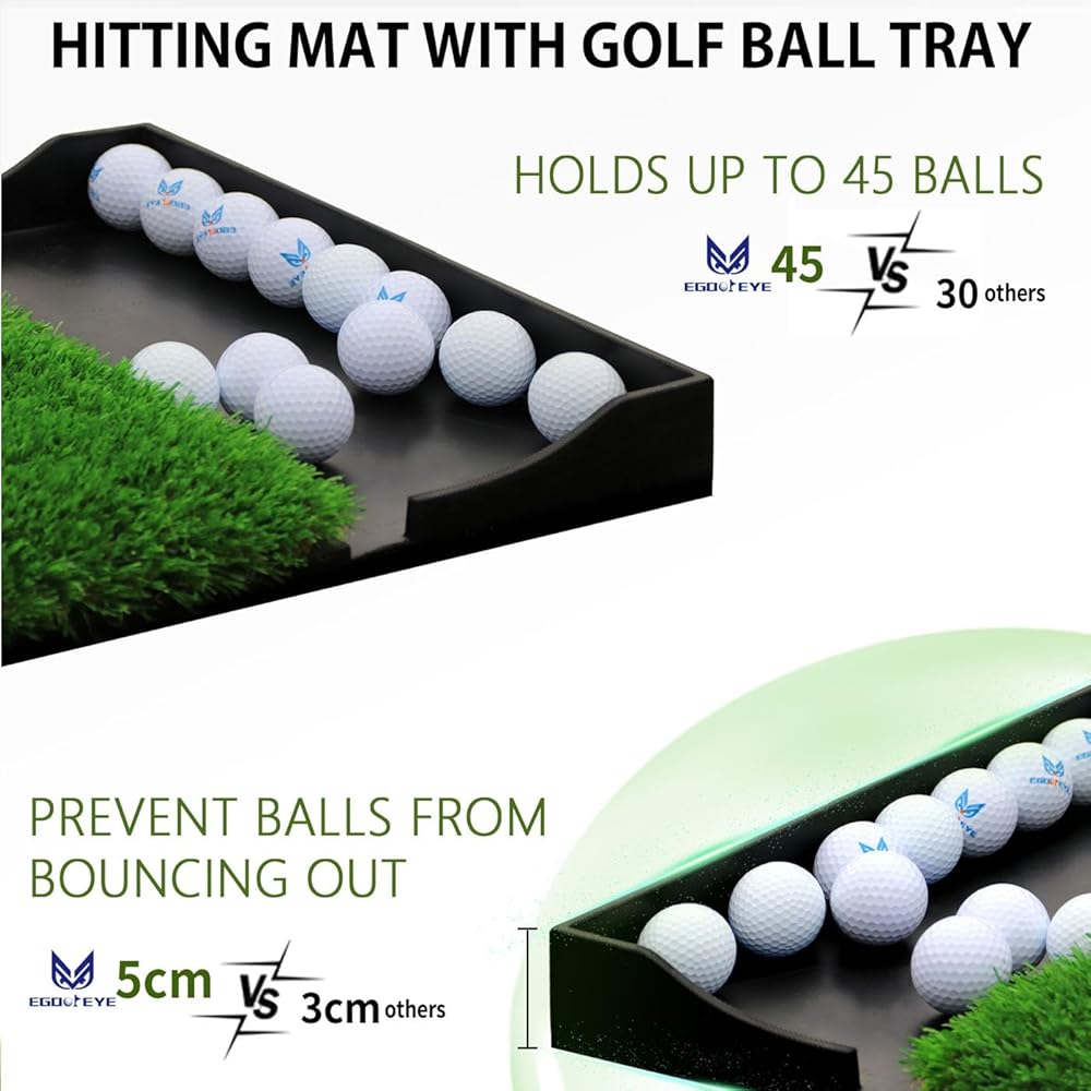 This golf practice mat holds up to 45 balls, providing more space than other golf mats. Moreover, the height of the ball tray, which is 5cm, effectively prevents the ball from bouncing out due to vibrations of the mat. This hitting mat is suitable for home practice, golf courses, or anywhere you want.