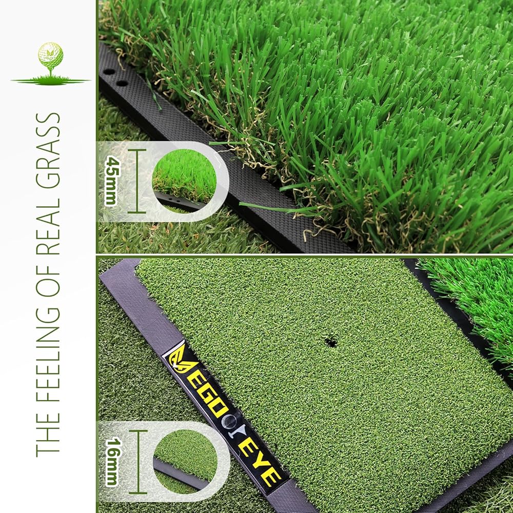 The high-quality dense artificial turf gives you the feeling of real grass for a natural swing. This mat is made of high quality materials and the rubber backing is 10mm thick and can take thousands of hits. With a special foam layer underneath, the mat can absorb and disperse club impacts, effectively preventing the separation of rubber backing and turf.