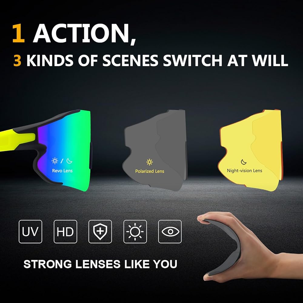 👓【3 INTERCHANGEABLE LENS】OULAIQI Baseball Sunglasses with 3 interchangeable lens.UV400 protection coating, blocks harmful UVA & UVB Rays, protect eyes perfectly.The first gray lens is polarized lenses against strong sunlight, the second is yellow and suitable for night activities, the third is ideal for driving and other activities.