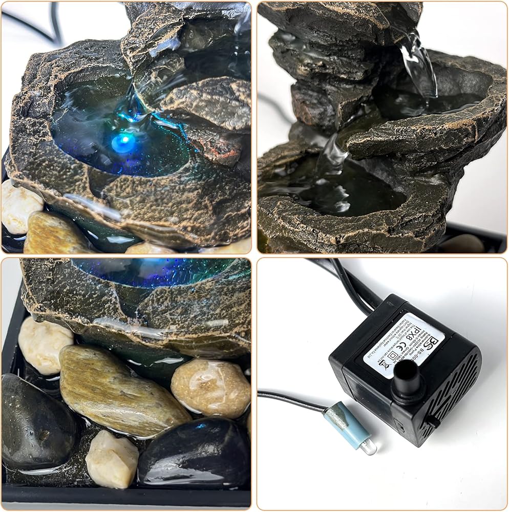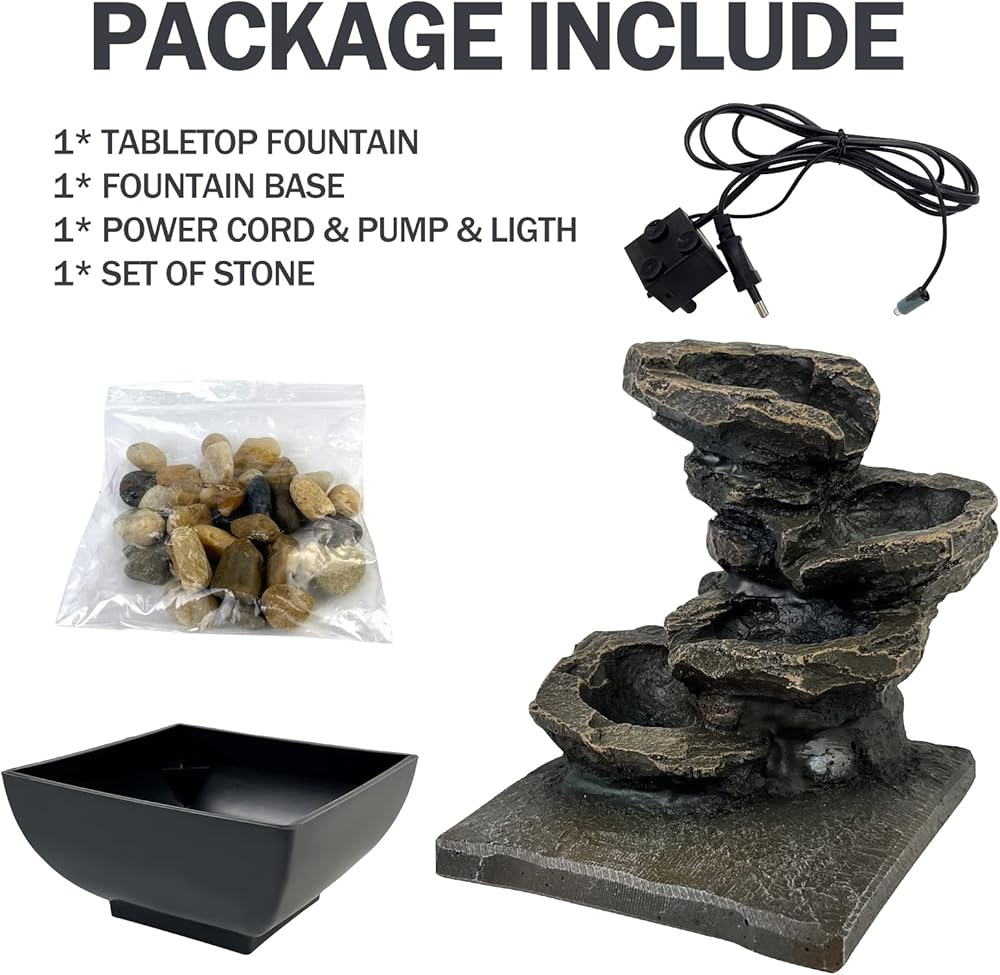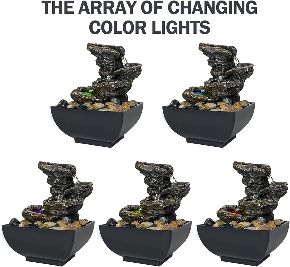 Decorative Tabletop Fountain - Bring a calming, zen, and decorative feel to any room, 4 tiers of water merging into a small waterfall, under the decoration of colored lights and rotating balls, the fountain adds beauty and tranquility. Perfect for decorating any table, desk, bedroom, bathroom or vanity in the room.