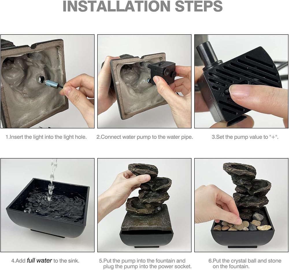 Easy to use - Just plug the LED into the hose then connect the water pump with the hose (When first use, you need to turn the switch of the water pump to "+"). Fill the base with water, and plug in the power supply to enjoy the relaxing desktop waterfall.