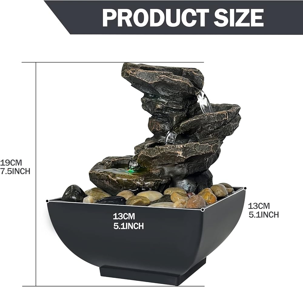 Size: Approx. 7'' x 5'' x 5''. The water flows from the top to the rock bed, like the sound of the waterfall. It is suitable for any table in your home and adds atmosphere to your living room, office.